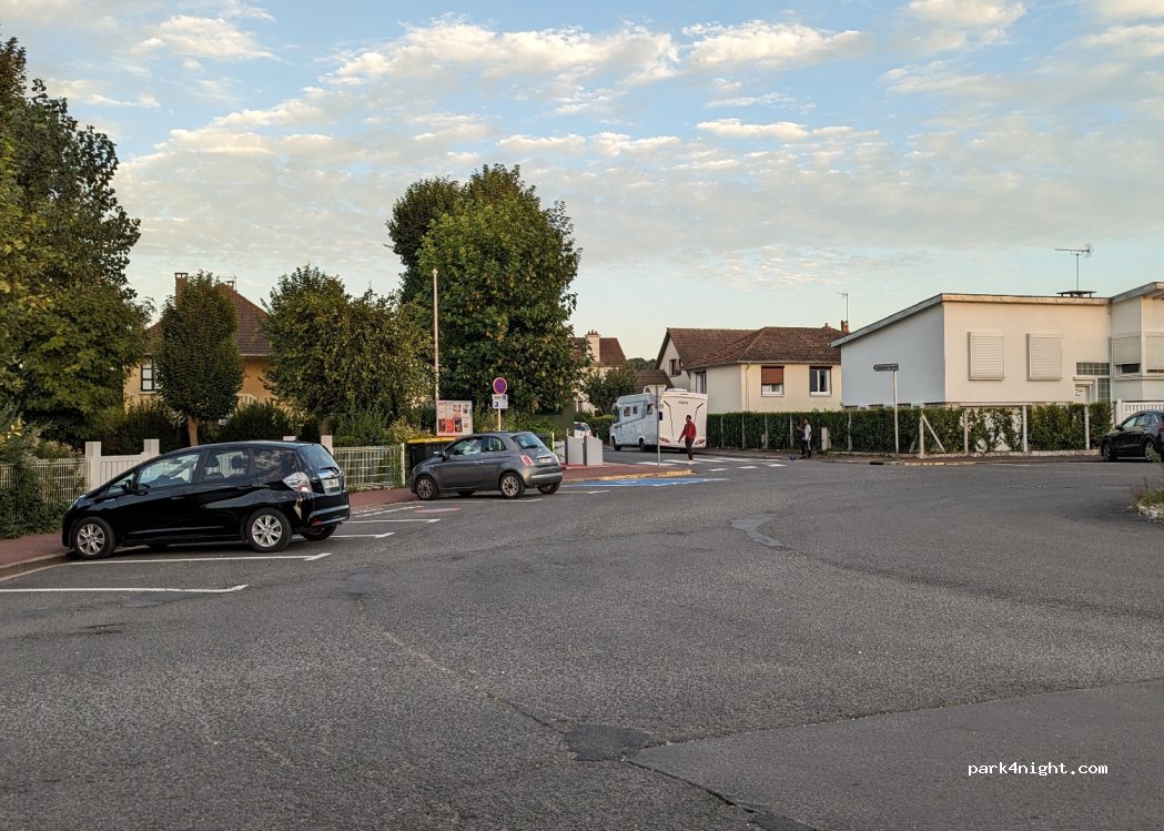 Au rond-point, il y a beaucoup de places de stationnement, aucun panneau indiquant qu'on ne peut pas dormir ici. un autre camping-car garé juste à côté de l'une des sorties.