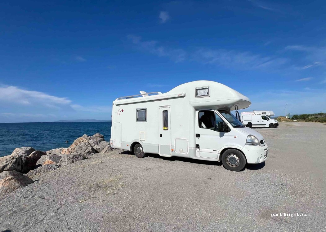 Na parkingu spędziliśmy około 2 tygodni ze względu na mały problem z samochodom. Żadnych problemów jeżeli chodzi o ludzi. Spokojne bezdomne psy. Mnóstwo ciągle przyjeżdżający i odjeżdżający kamperow. Właściciel kawiarni prosi nie parkować bezpośrednio przed jego lokalem. Łatwy dojazd. Bezpośrednio przy morzu.