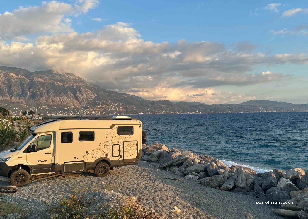 A peaceful rest area with a very clean beach. It’s important to respect that the bar owner owns the parking spaces in front of his venue. The spot is also conveniently close to a larger town, with several grocery stores and taverns nearby. Otherwise, this is one of the best motorhome stops in southern Peloponnese — calm, scenic, and well-maintained.
