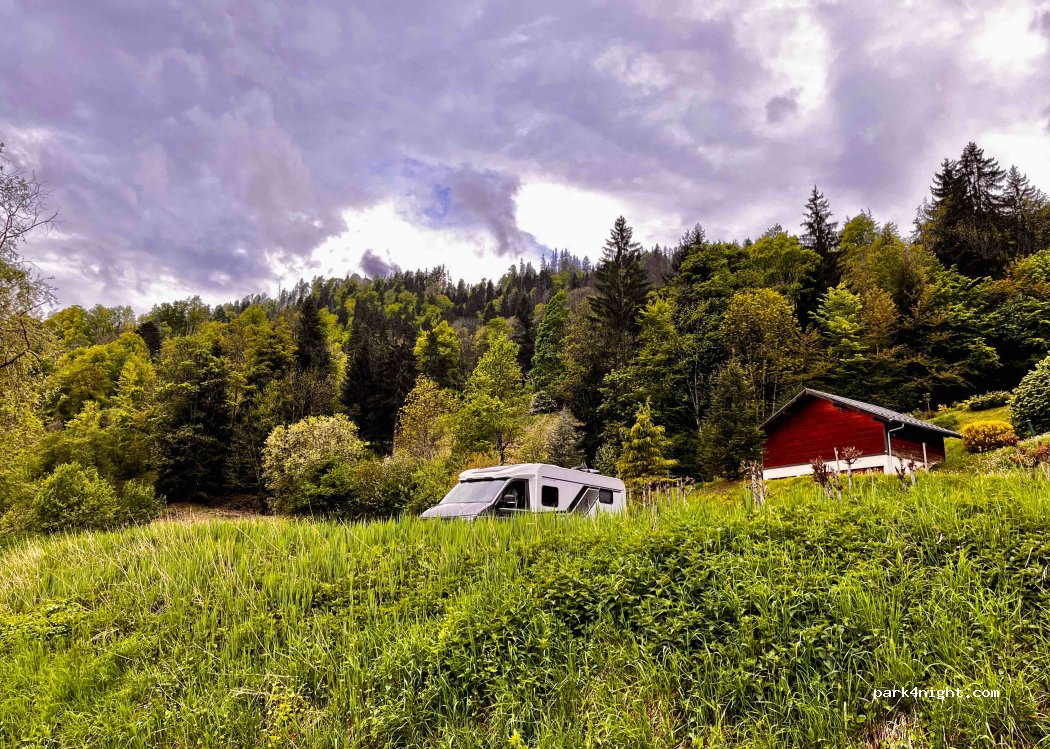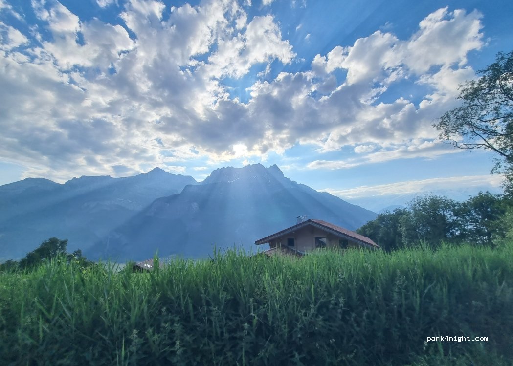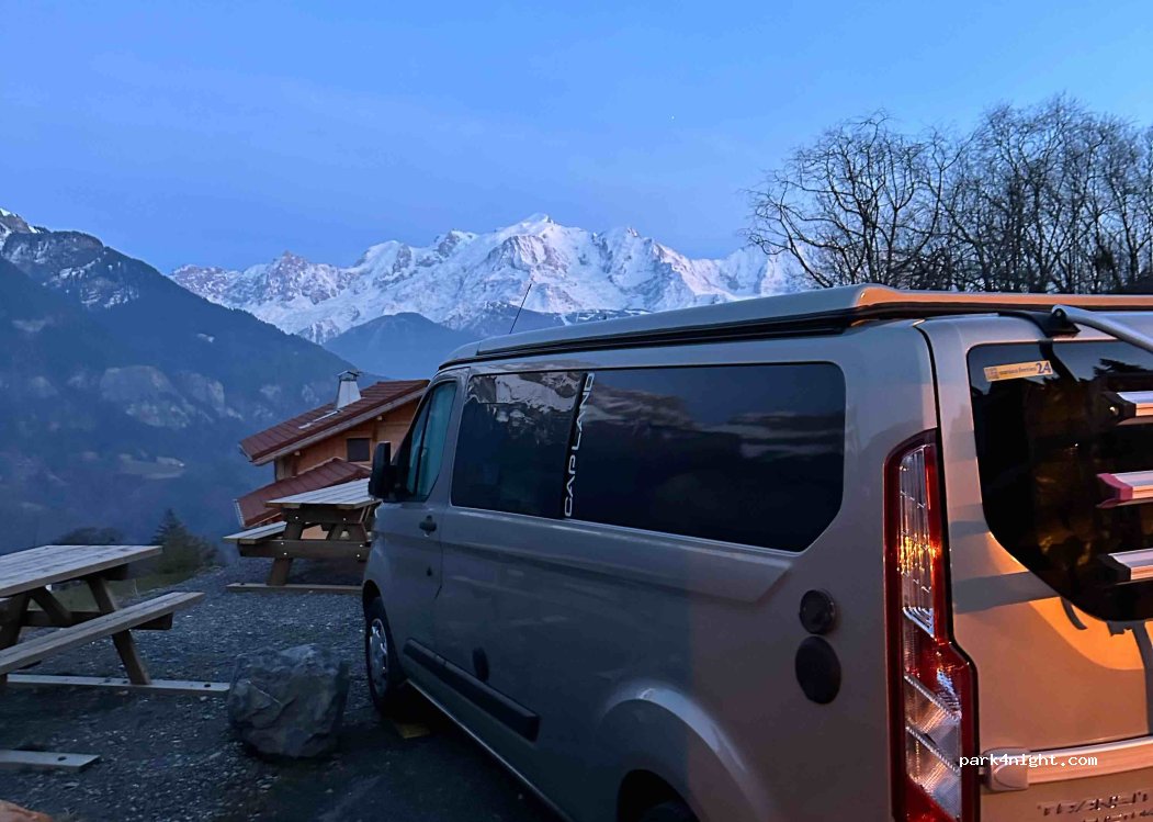 Route étroite et cabossée pour accéder au lieux en venant de Sallanches. Parking rempli de voiture, il restait 3 places. Parking plus adapté aux un vans et fourgons. Sinon belle vue sur le Mont Blanc (qu’une partie du parking à la vue). Nuit calme