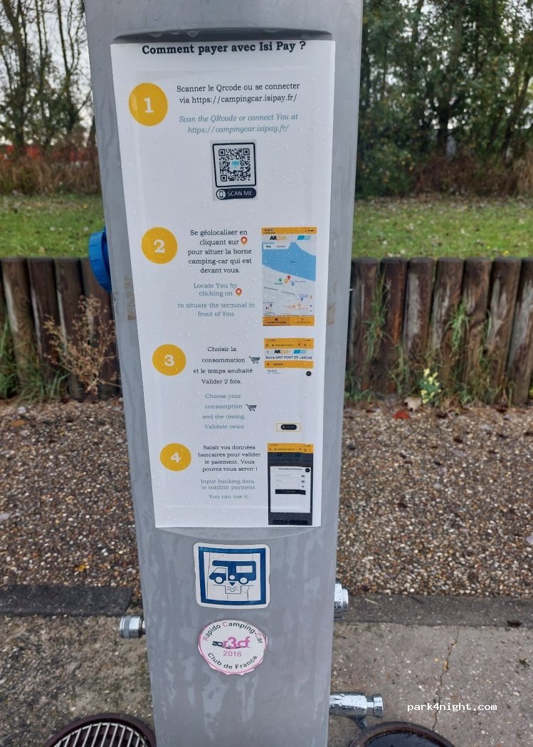 mit QR Scanner und Kreditkarte kommt man an Wasser und / oder Strom. Anlage befindet sich auf Lkw Parkplatz, für die Pause der Trucker. Man kann bei der Bezahlung die Länge der Nutzung auswählen und bezahlt dafür. 10 min für 2 € sind ca 80 bis 100 ltr Wasser. Säule ist etwas undicht, kann nasse Füße machen.