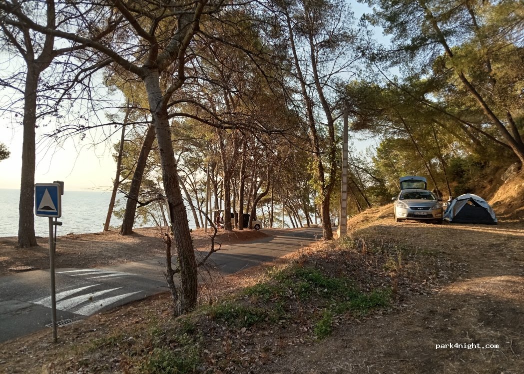 Several possible parking spaces along the paved road. Little passing. Parking under the pines so shaded and well ventilated. Splendid view and swimming close to the spot. Cicadas as a bonus and restaurants in the Port not far away.
