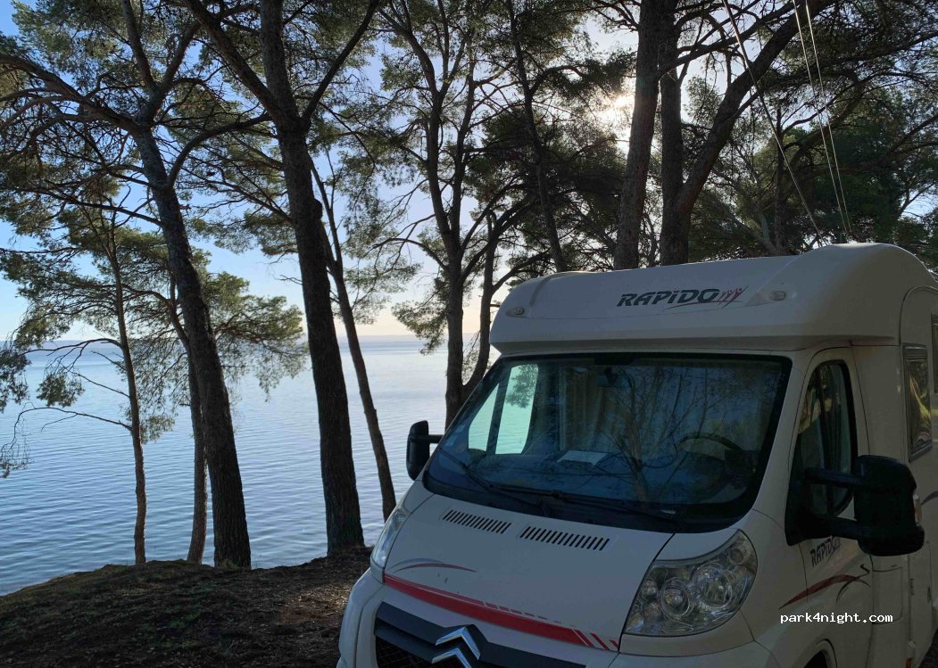 Mehrere mögliche Parkplätze entlang der asphaltierten Straße. Wenig vorbei. Parken unter den Pinien, so schattig und gut belüftet. Herrliche Aussicht und Schwimmen in unmittelbarer Nähe. Zikaden als Bonus und Restaurants im Hafen nicht weit entfernt.
