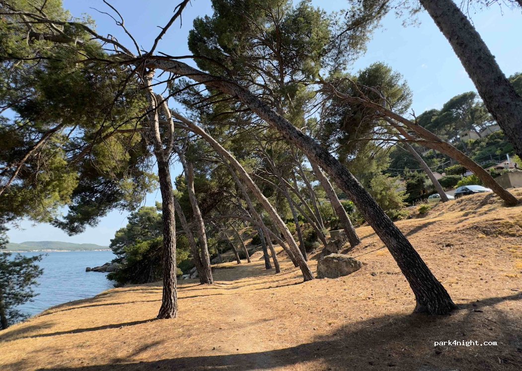 Plusieurs stationnements possibles au bord chemin goudronné. Peu de passage. Stationnement sous les pins donc ombragé et bien venté. Vue splendide et baignade à ras du spot. Cigales en prime et restos du Port pas loin.