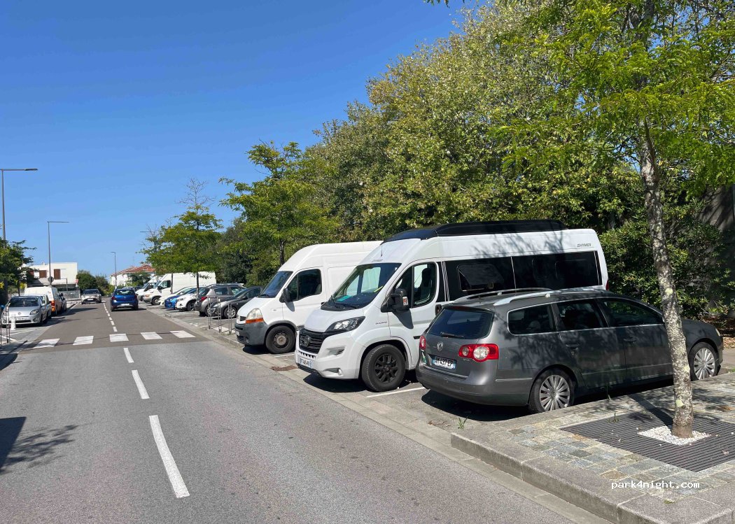 Nous nous sommes garé ici pour la journée. Gratuitement. Notre 6 mètres dépasse légèrement sur le trottoir et sur le début de route (photo). À proximité, dans le rond point nous avons loué deux vélos électriques parents-enfants en libre service (application Pony) pour visiter la côte et le centre ville. Parfait.
