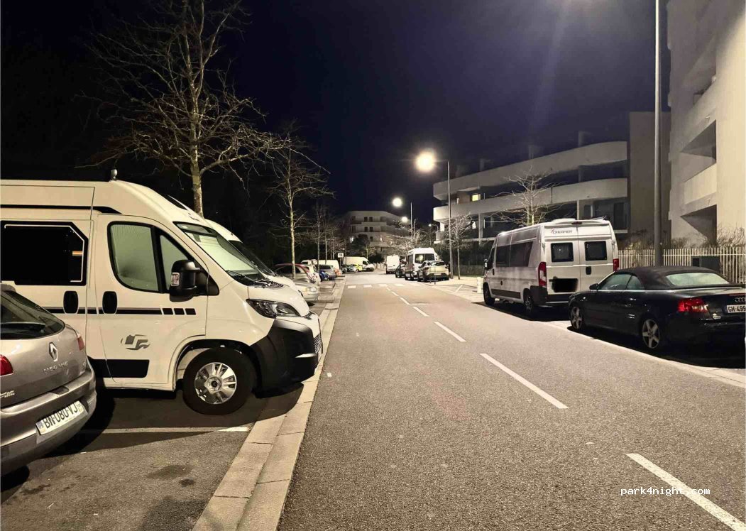 j'ai passé la nuit la et franchement après 5h de route sous la pluie la route a côté ne m'a absolument pas dérangé de toute façon sur biarritz il n'y a rien de prévu pour les camping-car excepté lntermarchė pour faire les services ,merci a eux.. et 1 aire payant mais qui est en travaux actuellement bref des efforts a faire pour la commune et la region