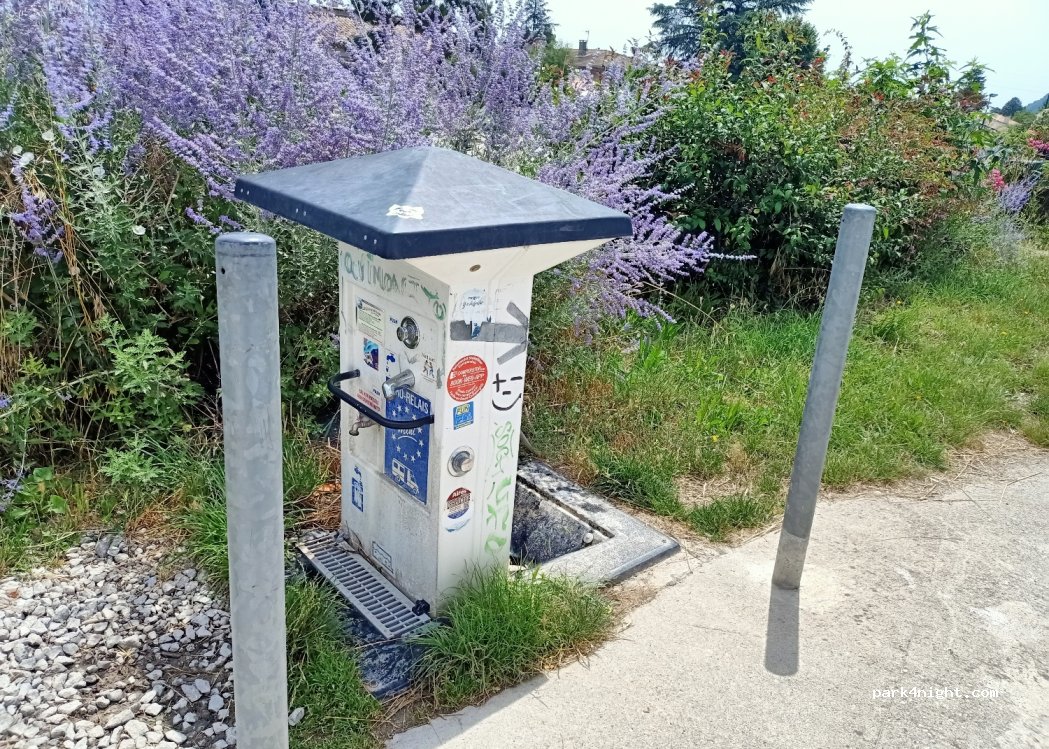 Plusieurs emplacements semblent occupés par des camping cars garés durablement. Le parking était plein lors de notre arrivée. Emplacement bruyant, en bord de route. Nous avons pris de l’eau et sommes repartis.