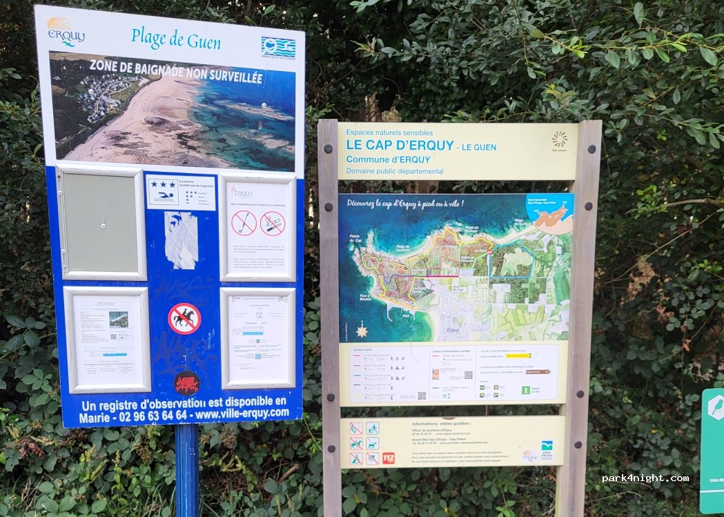 Parking at Portuais beach, town of Erquy. Empty car park in the evening on December 28, departure from hiking trail and beach about 150 meters away. No concern for space for our two motorhomes, little traffic, no height limitation. Forbidden to the motorhome from 9 p.m. to 7 a.m. but we were not bothered for 1 night spent. Beach prohibited for dogs from May 15 to September 15.