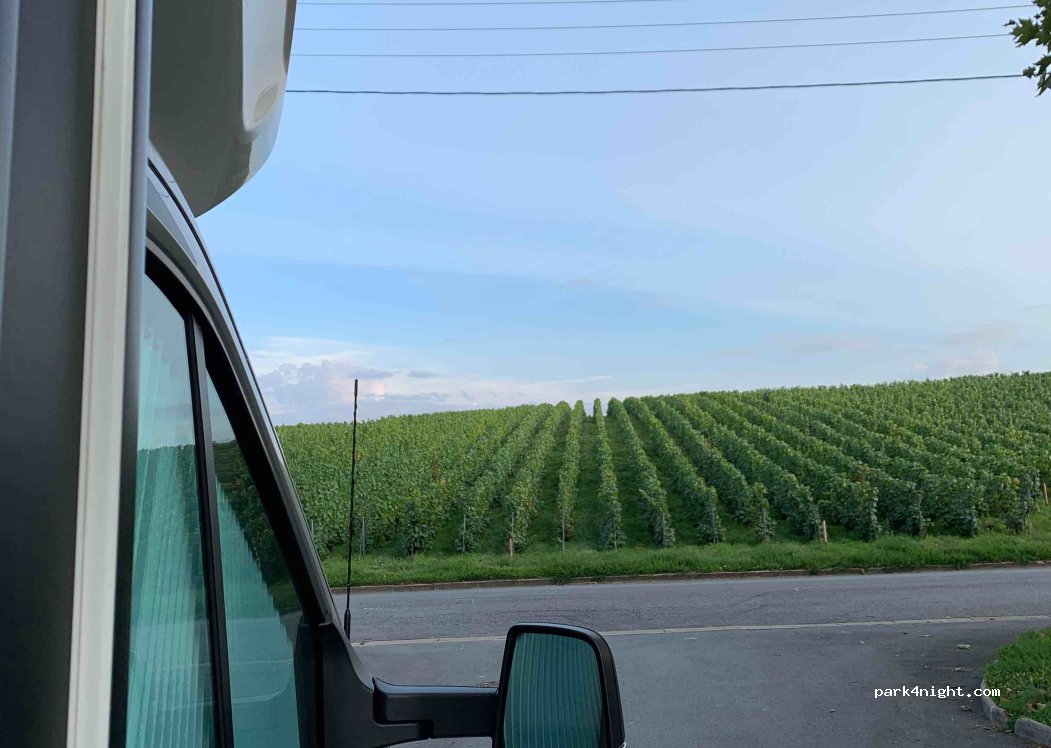 The municipality also allows parking in the gymnasium car park (with trees) which is nice. This is the place I chose, facing the vines and with a playground for the children. The photos correspond to the gymnasium parking lot where there are no services. Dog waste bags.