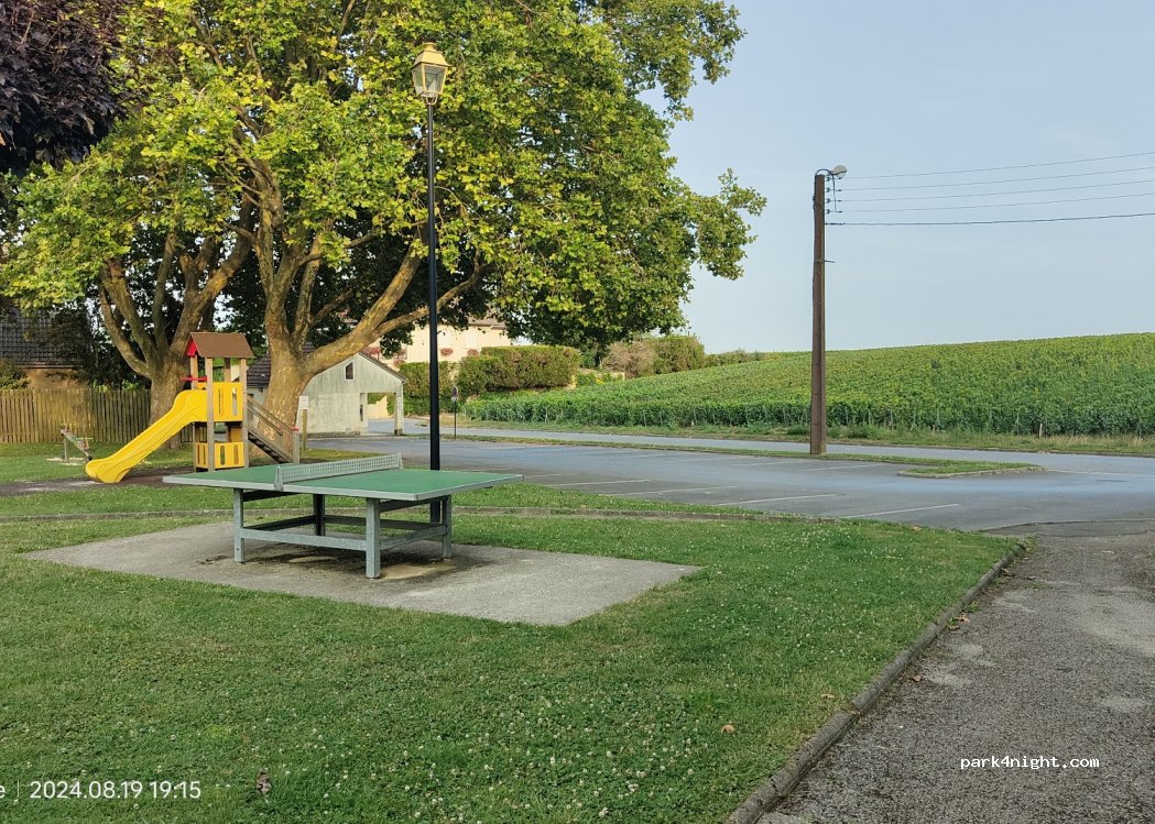 La municipalité autorise aussi le stationnement sur le parking du gymnase (arboré) ce qui est sympa. C’est ce lieu que j’ai choisi, face aux vignes et avec aire de jeux pour les enfants. Les photos correspondent au parking du gymnase où il n’y a pas de services. Sacs pour déjections canines.
