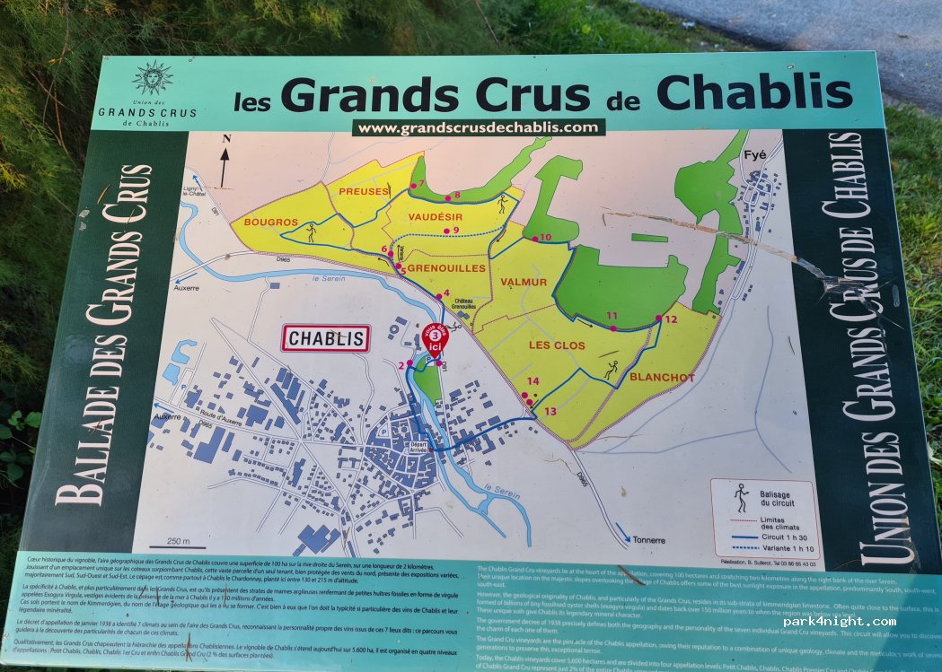 Posto tranquillo a poche centinaia di metri dal grazioso centro di Chablis. Il parcheggio è adiacente ad un bel parco. Notte tranquilla, con il suono del fiume ad accompagnare il sonno.