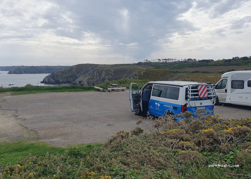 Superbe et vraiment très cool ! Une excellente alternative à la pointe du Van ou le stationnement n'offre aucune perspective sur la mer et la pointe du Raz au stationnement payant (et très cher !) très loin de la pointe, devenue hyper touristique et pas du tout sympa, ici, c'est vraiment authentique. Belle nuit sur un parking relativement plat, que du bonheur !