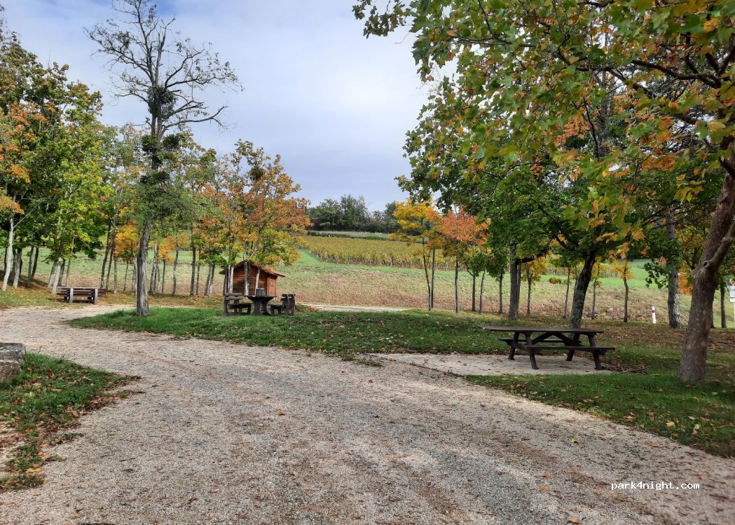 4 tables, 3 poubelles, ombragées parfais pour la pose de midi toutefois bruit de fond autoroute et ligne TGV