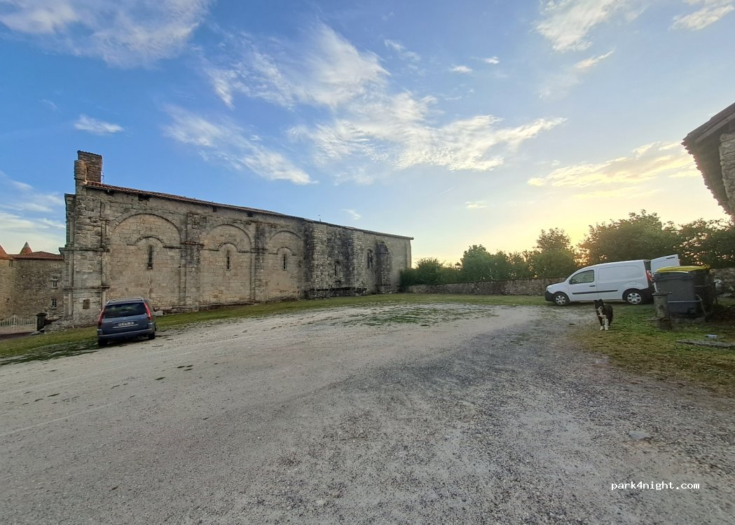 Petit parking (mi cailloux mi herbe) pour dépanner une nuit, à côté d'une église (qui ne sonne pas)