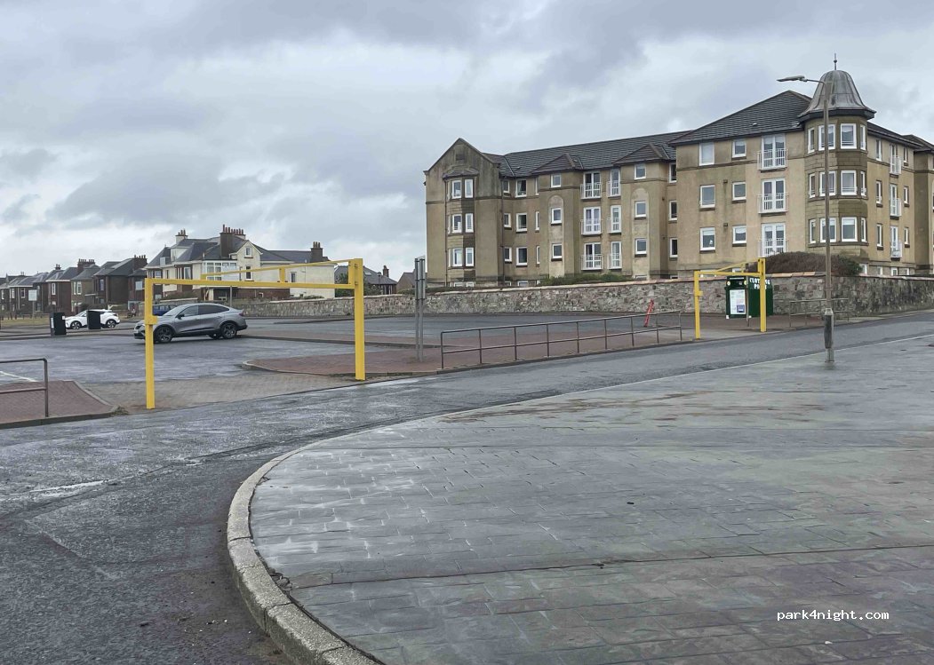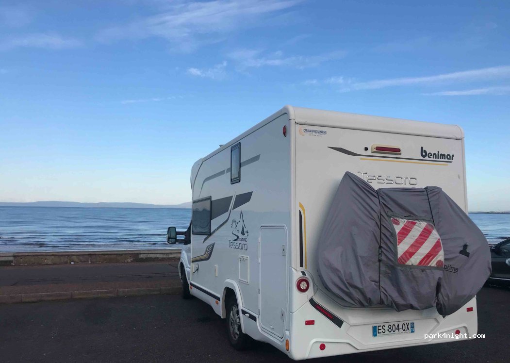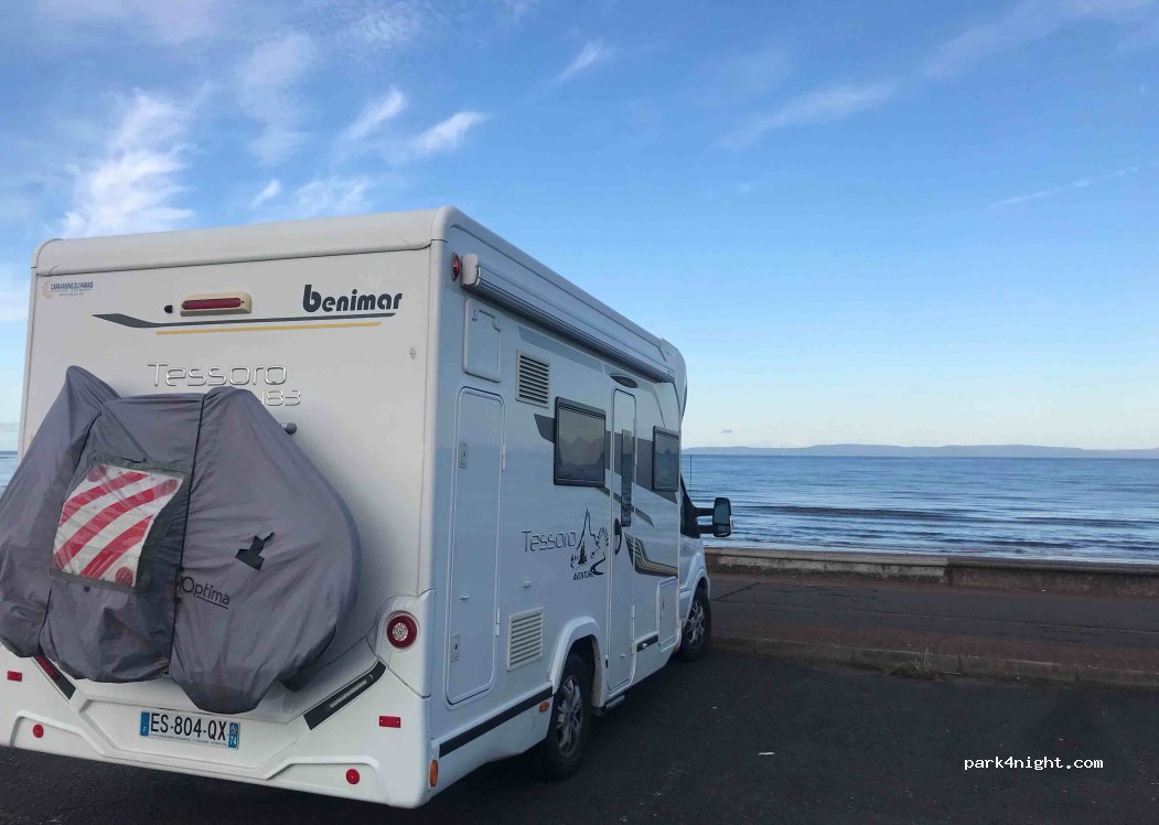 Stationnement sans aucune interdiction mentionnée pour le stationnement des CC. Face à l'île d'Aran, un peu en pente mais reçoit sans problème plusieurs CC. Nous avons passé la nuit au son des vagues car petite école de voile à proximité