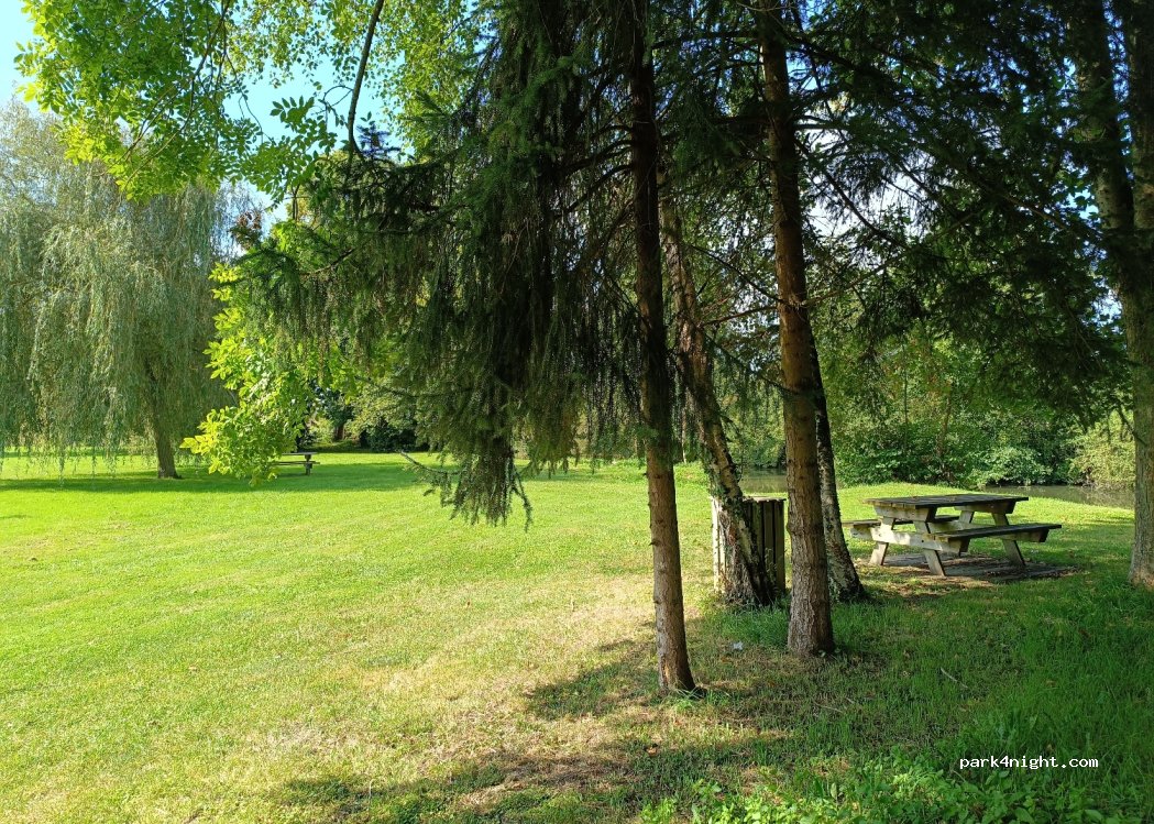 Neat parking. Large garden with picnic tables on the banks of the Huisne.