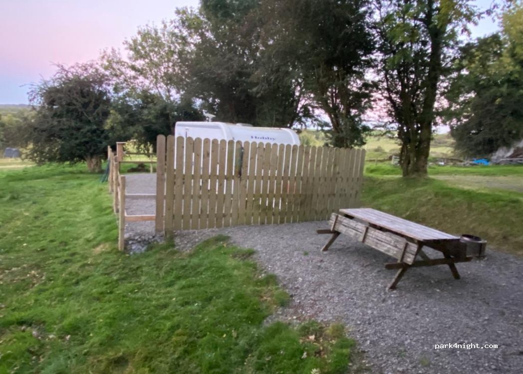 Très accueillant et sécurisant. Des places en gravier et herbe. Brasero et bois offert pour les grillades ( grille d’une propreté exemplaire) et une table de picnic par emplacement. Le chalet avec douche, XV et cuisine sont propre, l’eau est chaude. N’hésitez pas surtout d’appeler avant pour avoir le code de la barrière d’accès au site. La famille est d’une gentillesse typique des Irlandais.