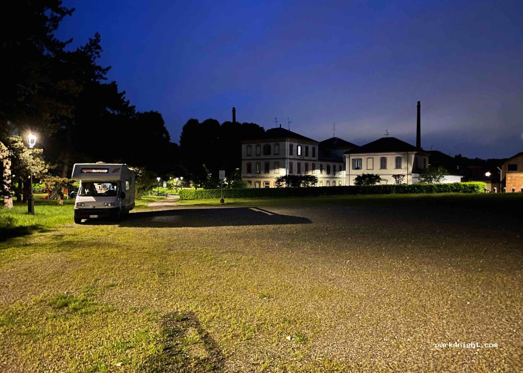 Super endroit avec toilettes et eau. La ville est vraiment à visiter pour ceux qui aiment l'architecture industrielle. Pour la zone ZTL, il suffit de ne pas y venir avant 19h et de repartir avant 14h pour éviter l'amende. Il y a deux parkings, on accède au deuxième par une petite route en terre le long des jeux pour enfants. Il y a des balades de chien le soir.