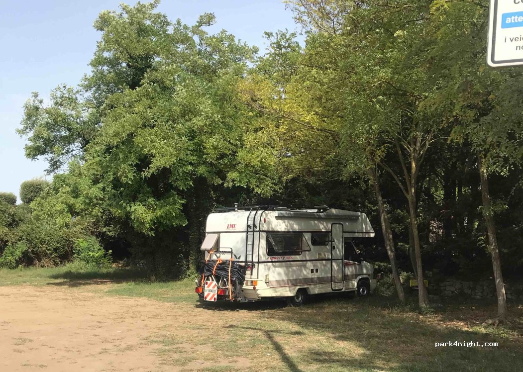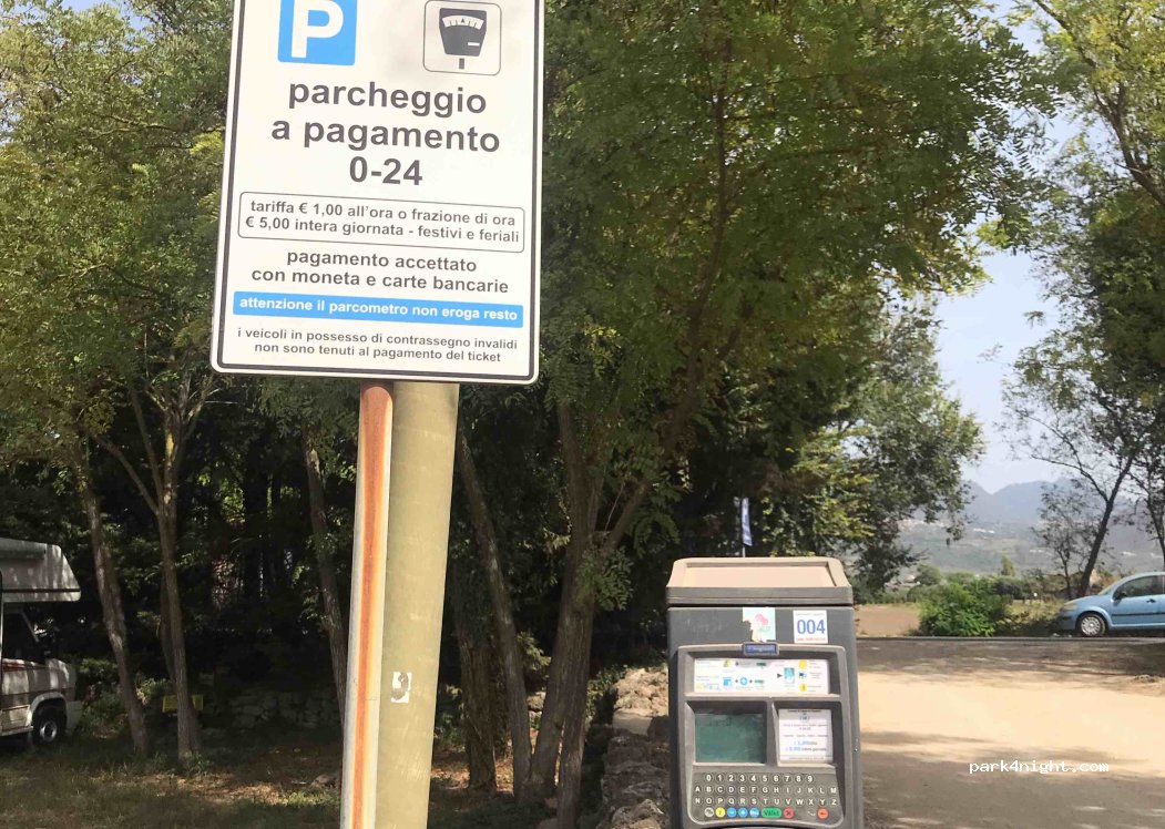 Parcheggio a pagamento 5 € dalle 0,00 alle 23,59 con delle zone all’ombra e a pochi passi dal sito archeologico. Purtroppo abbiamo sostato qui la notte tra il sabato e la domenica circondati dal viavai delle macchine e la musica a tutto volume di una discoteca fino a mattina.