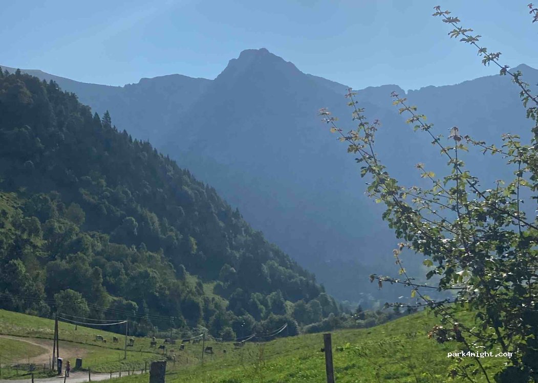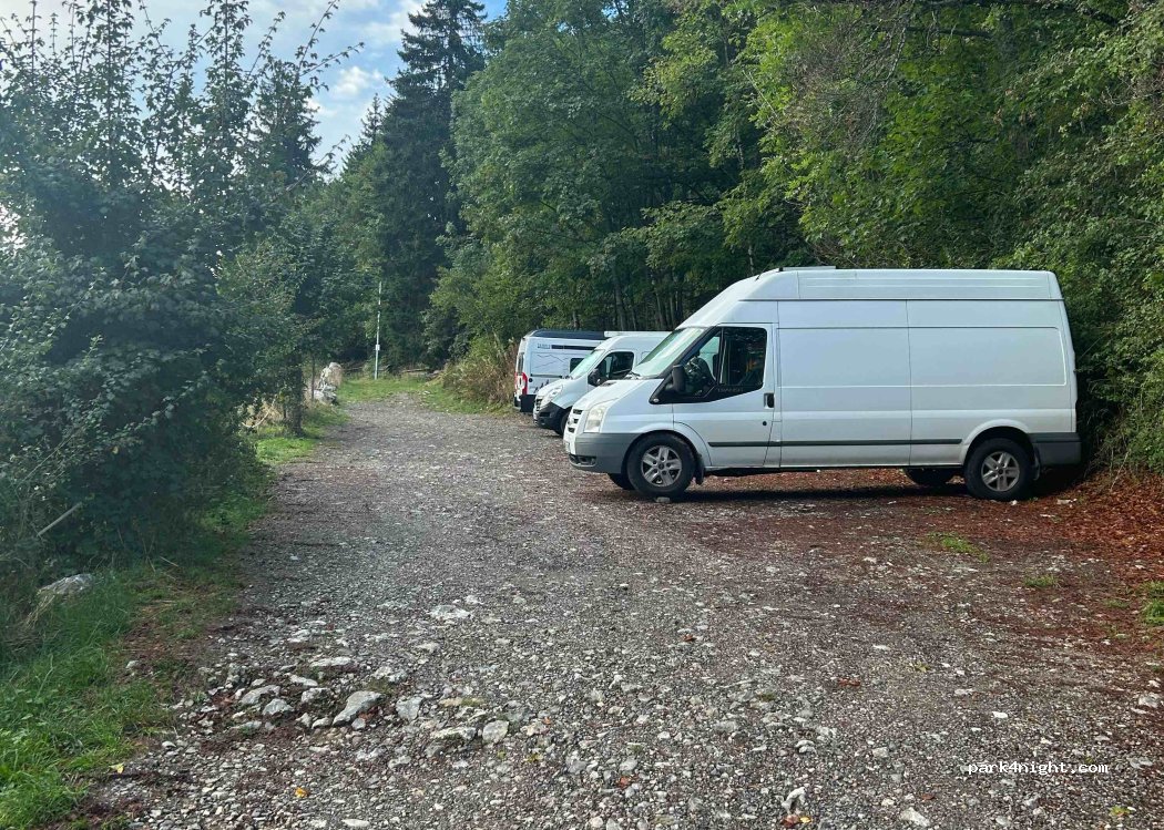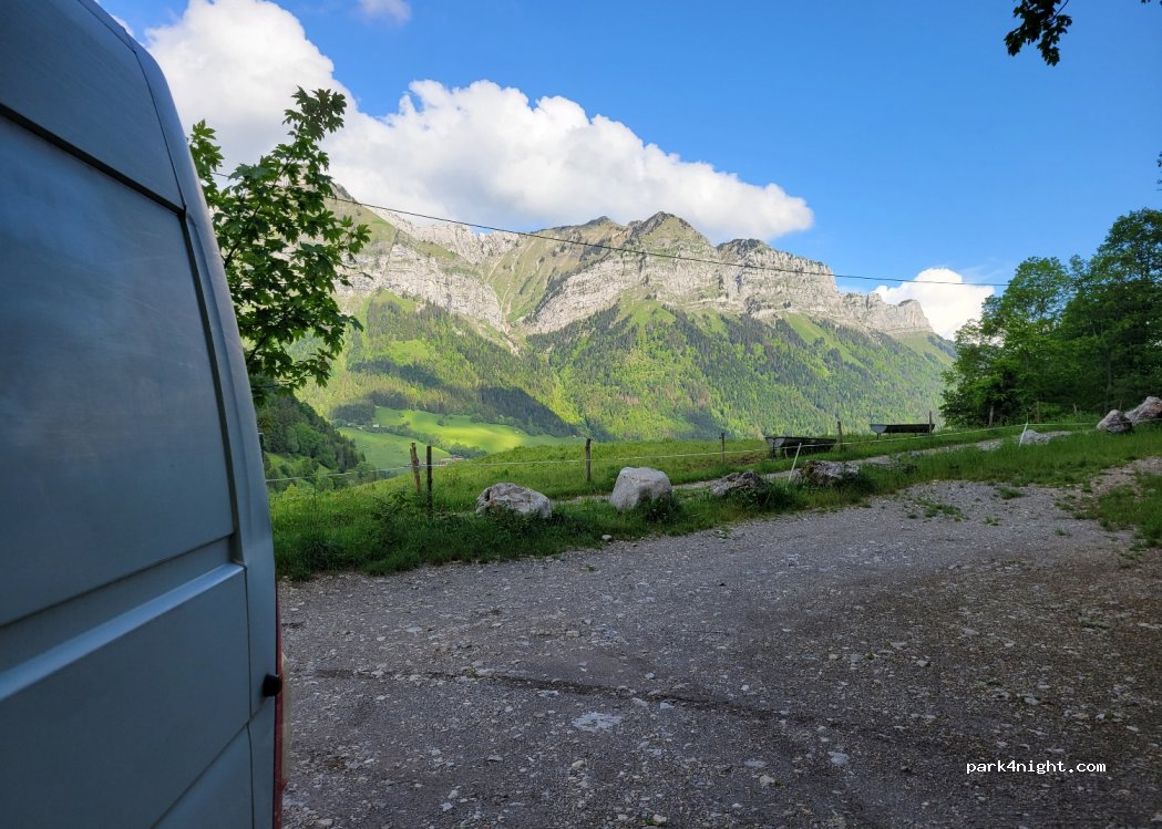 Parking at the Col de la Forclaz, on the right after the Balcon du Lac restaurant when coming from Annecy or on the left when coming from Montmin, slightly sloping, paid parking from 9 p.m. to 7 p.m. Free at night. We spent one night, very quiet, no noise. Possibility of putting 6/7 vans or camper vans
