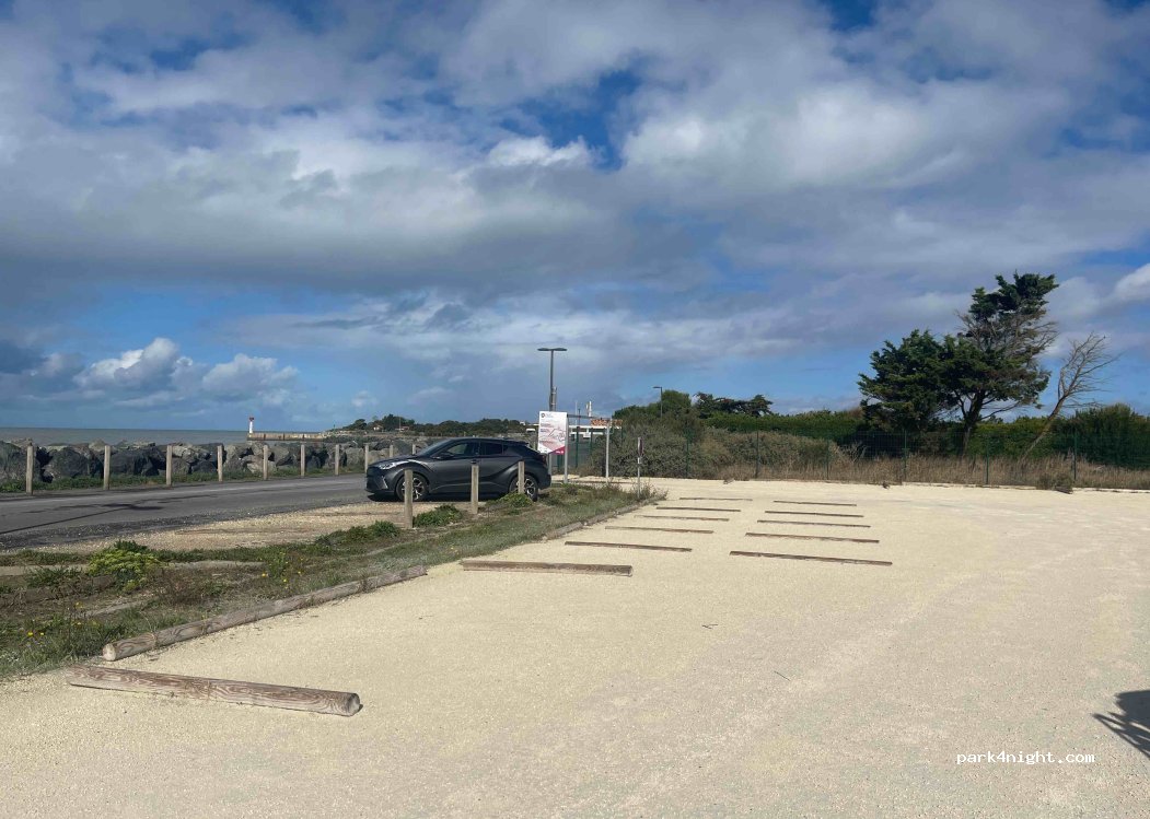 Recent parking, height limit of 2.10m therefore for van, twenty spaces available. Sea view on one side and oyster pond on the other. View of the Île de Ré bridge. No access to the beach. No swimming. No ban on spending the night there. We had a great night there, we were alone. Restaurants 150m away. Public toilets are 150m from the car park opposite the small port.