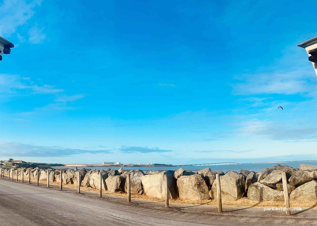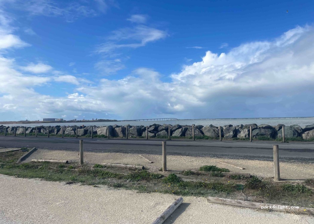 Emplacement calme et avec le bruit des vagues. Uniquement pour van car il y a une barrière de limitation en hauteur (2m10)… Face à la mer et au pont d’accès à l’île de Ré.