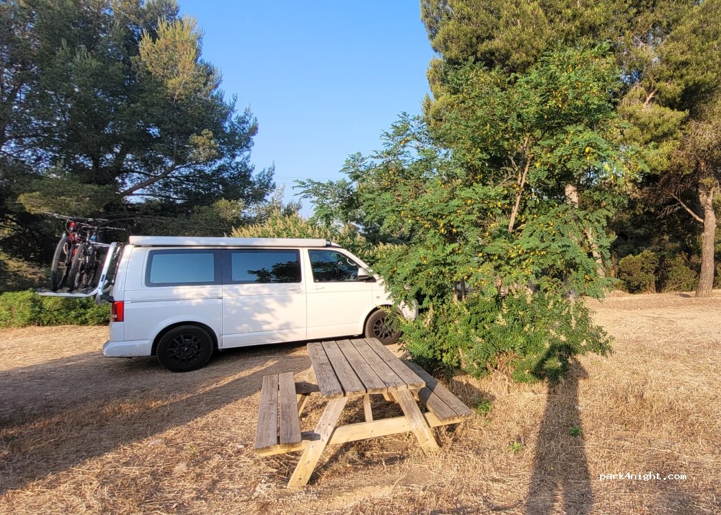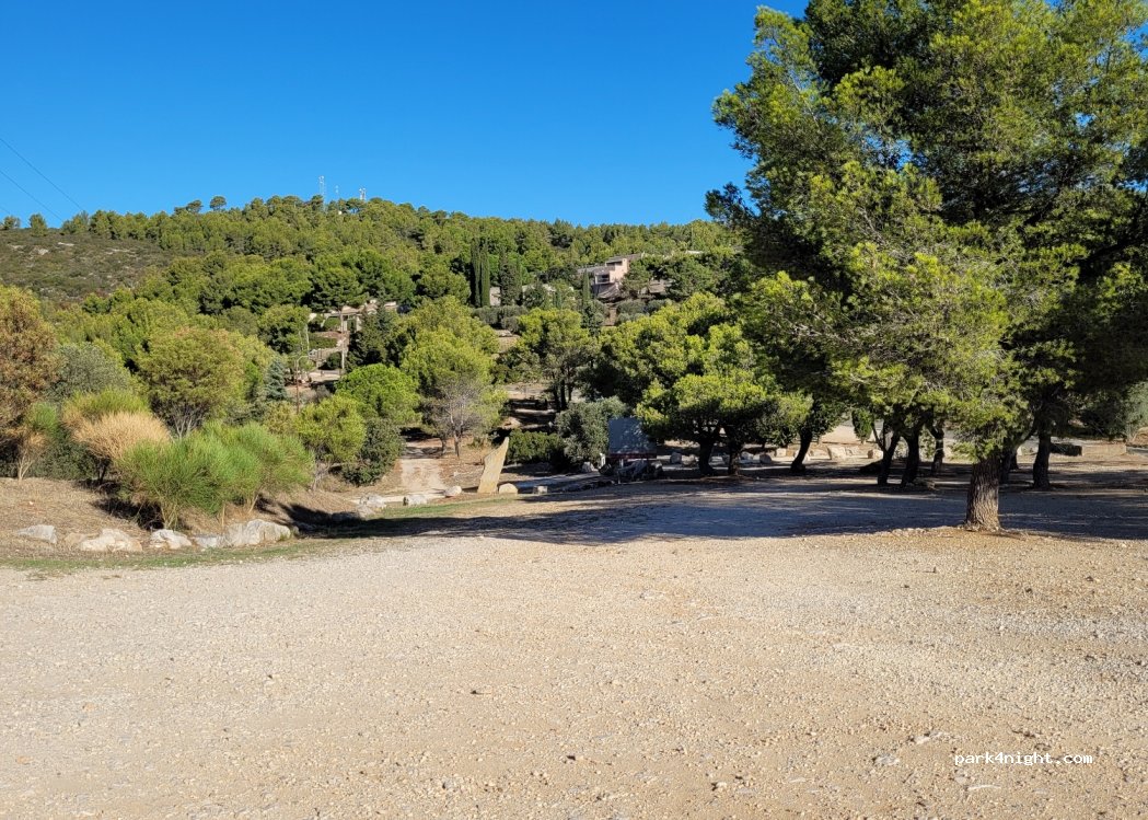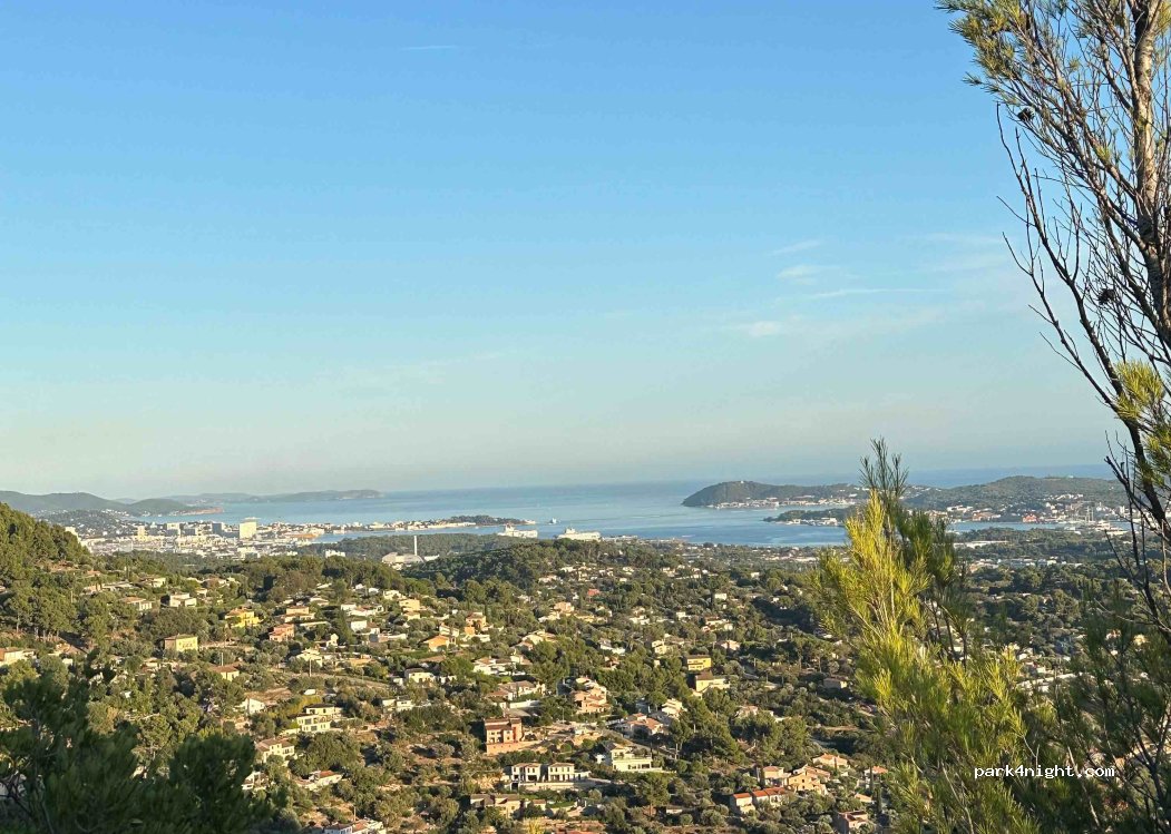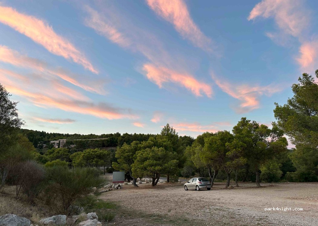 Wonderful peaceful parking area with some pine trees, plenty of space, though slightly sloping. Occasional passing car and dog walkers. View over Toulon to the sea if you walk up the road 100 metres. As far as we could see, no prohibition for camping cars. Recommend!