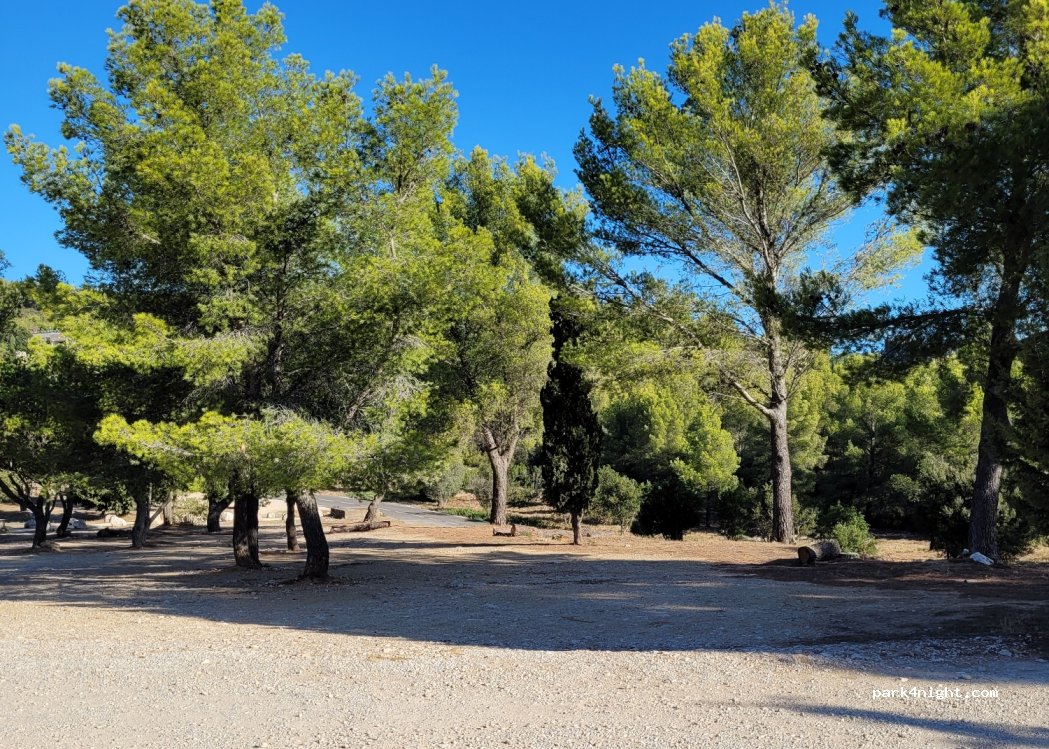 Parking sous les pins en bord de route. Calme la nuit et plutôt plat. Par contre l'accès par le village d'Ollioules n'a pas été aisé avec notre CC de 7 M car certaines rues sont trop étroites : nous avons dû faire des détours pour y arriver.
