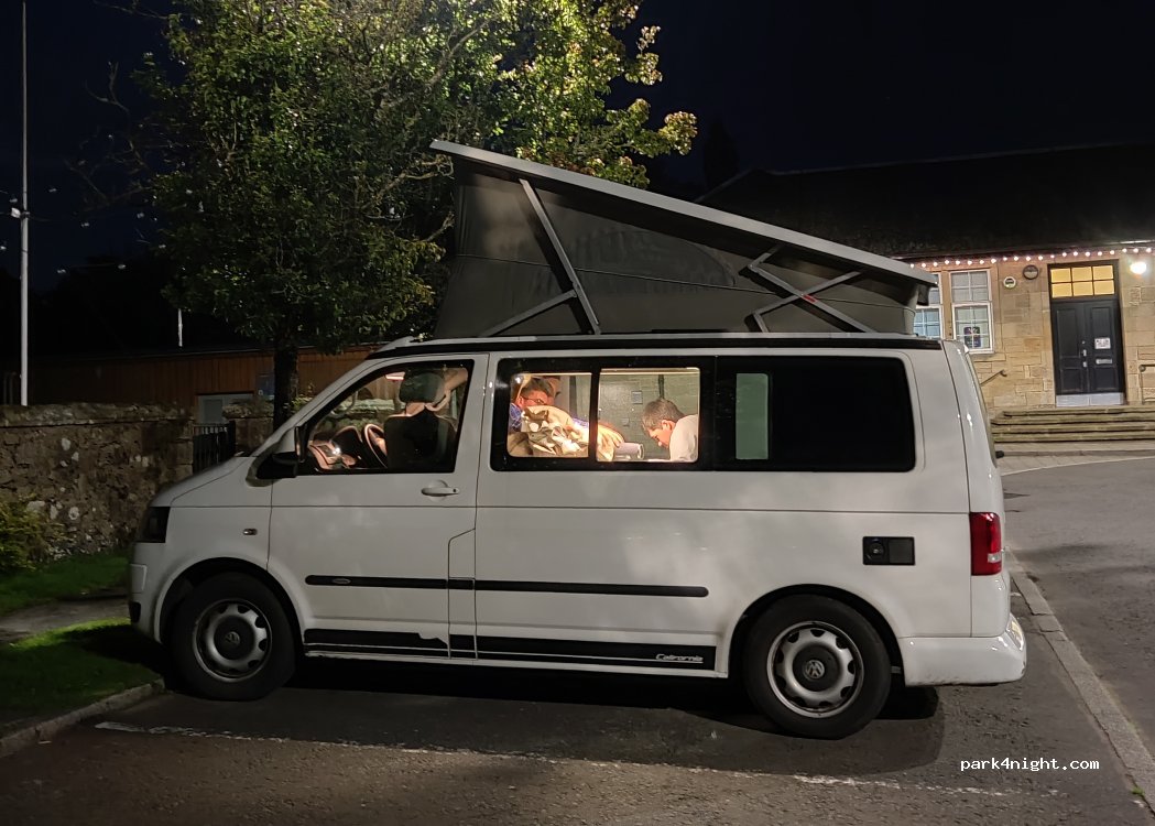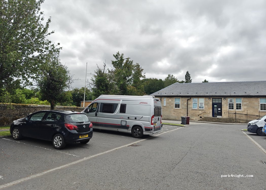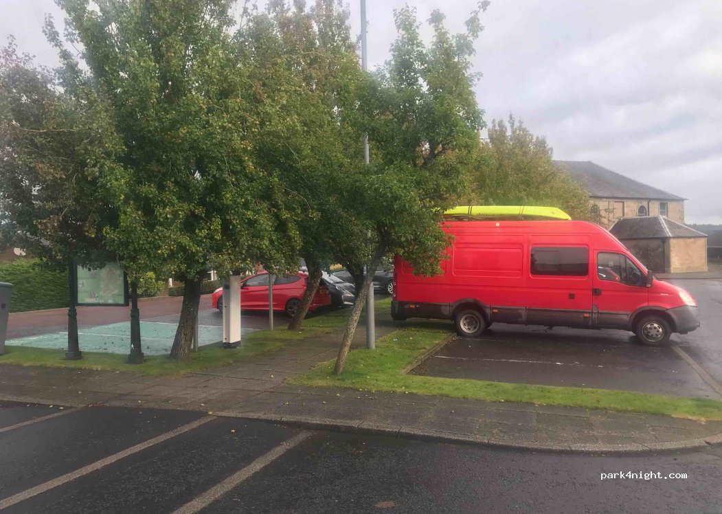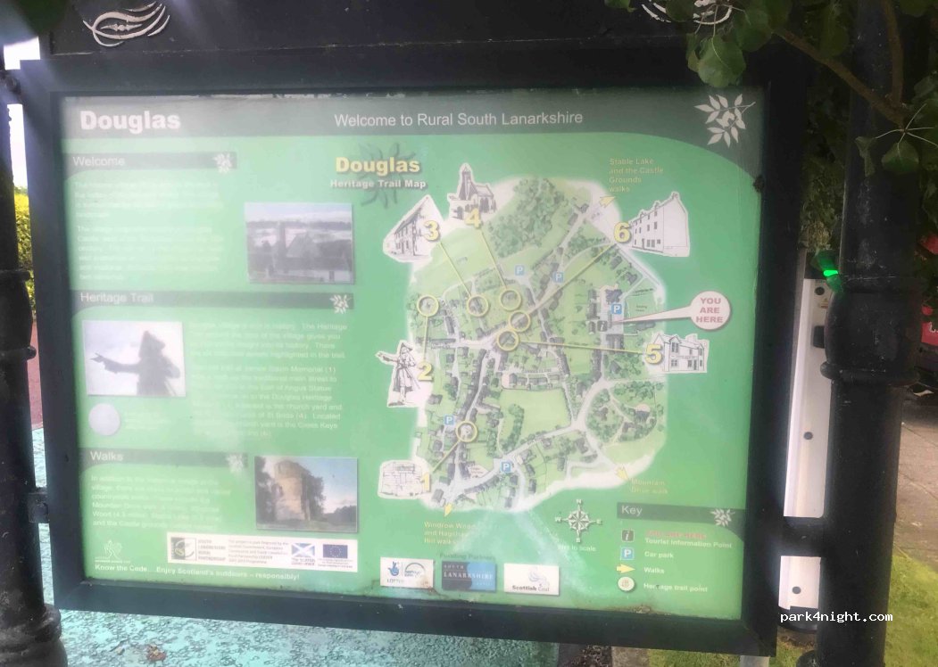 Fantastic car park at the community centre. Douglas is a lovely village with excellent park ups (plenty overnight options too). Ignore the 1 star reviews which have been made by locals to keep people away. This is an excellent car park, plenty of spaces for vans and has electric charging points for electric cars/vans too. While parking here there are toilets at the car garage.
