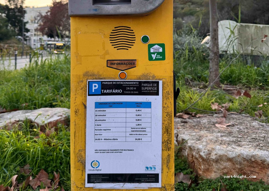 Lors de notre visite à Albufeira, nous avons fait la découverte de ce parking. Cependant, nous étions déjà installés sur un autre parking. Des camping-cars étaient présents. Les tarifs du parking sont visibles sur la photo.