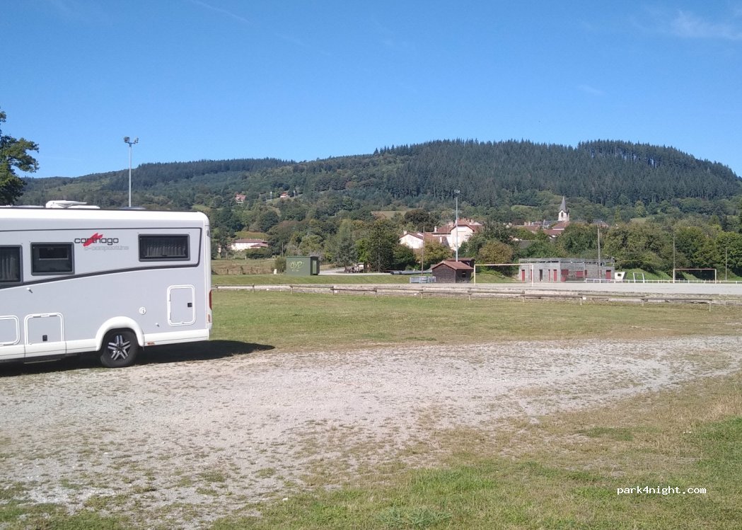 Superbe endroit gratuit pour passer une ou deux nuits au calme dans un cadre verdoyant. Plusieurs places disponibles sur terrain stabilisé. Soyons respectueux et faisons travailler le commerce local : boulangerie boucherie pizza supérette fromagerie production locale pharmacie. WC au stade. Très belles randonnées à pied et VTT autour.