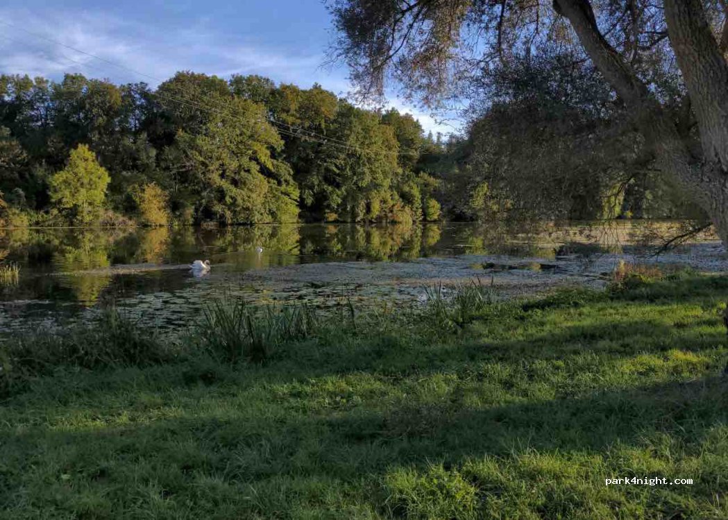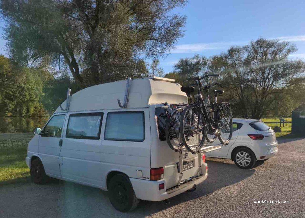 Next to Le Pavillon Bleu there are public parking spaces in a quiet location next to a river and overlooking a lake with a water fountain. There is even a picnic table. Internet connection is not that great DL: 10mbps UL:0.6mpbs