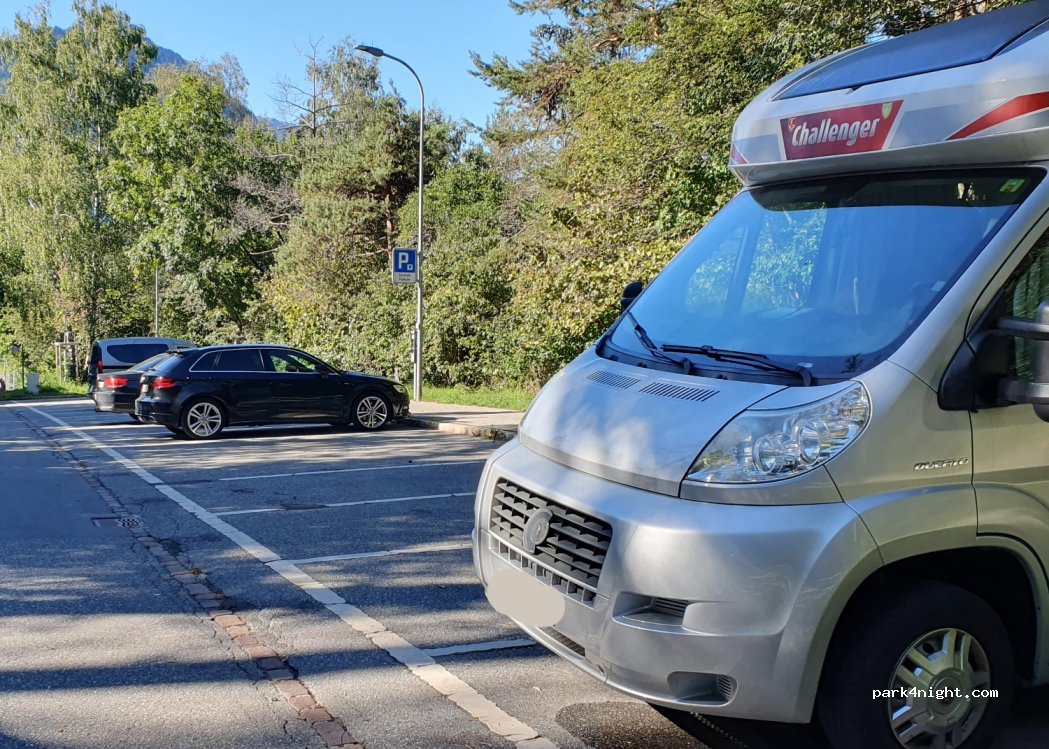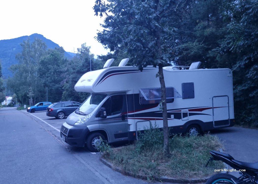 leicht schräger Parkplatz. Von 08:00 - 19:00 1.20 CHF pro Stunde. Wenig Verkehr, da am Ende einer Sackgasse. Konnten mit 7m Camper stehen, wenn man Rückwärts einparkt und mit dem Heck über den Gehsteig ragt. Trinkbrunnen gleich nebenan. Kein Gewinde, aber man kann den Standard Schlauch hineinstecken und passt genau.