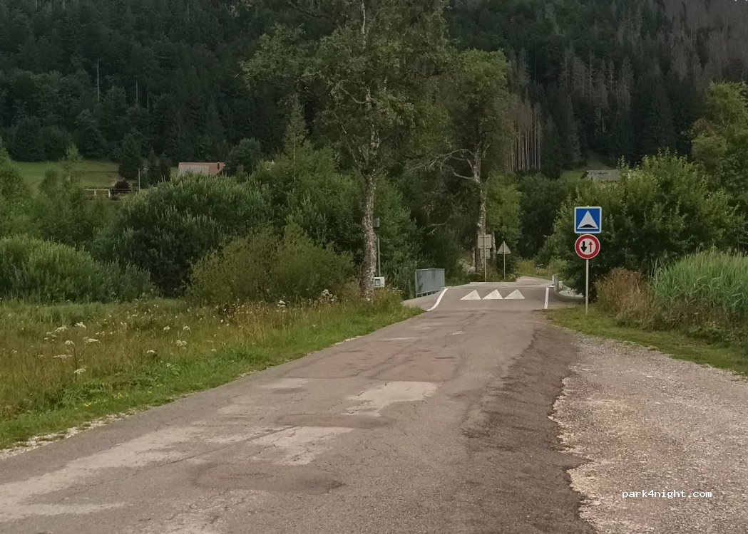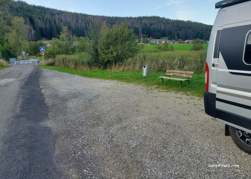 Petit parking avec un banc et une poubelle au bord d'une petite route très peu passante en journée et personne la nuit. nous avons passé une nuit au calme. La poubelle est petite ce n'est pas pour vider celle du camping-car.