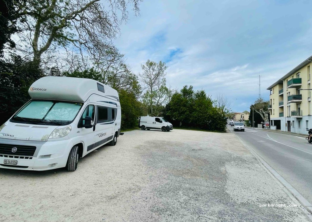 Very practical gravel parking if the area is full. Stayed one night, another campervan was present. Quiet night (obviously without taking into account the traffic noise but which was not disturbing at night). Trash+sorting containers right next door. Mosquitoes in the evening due to the presence of a pond just above.