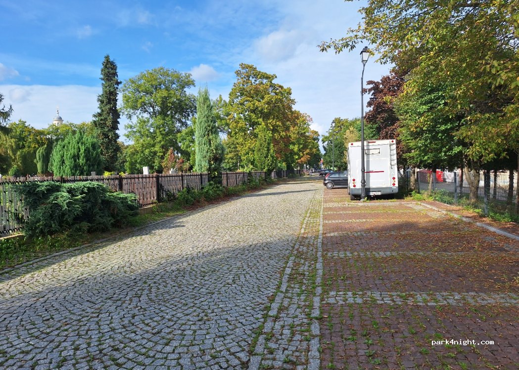 Wir haben hier weiter hinten in der Sackgasse zwei Tage und Nächte gestanden. Es waren viele Parklücken frei. Angenehm ruhig und fühlt sich sehr sicher an. Innenstadt fußläufig erreichbar. Am Rand vom Friedhof gibt es Frischwasser, wenn man an den Zaun fährt kann man mit Gardena Schlauch problemlos auffüllen - natürlich darf man dabei keine Friedhofsbesucher stören.