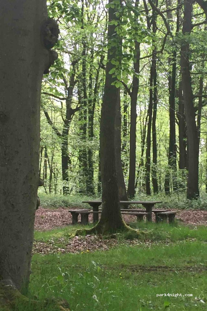 In the evening we could hear cars on the road. Two stopped at the parking, one in front of us, one behind. Two people got out of one car & went into the dark forest for 5 minutes, returned and left. The other car left shortly after we went outside to check the situation. Other than that we encountered runners and dog walkers, all friendly. Nice meadow with picnic tables surrounded by trees.