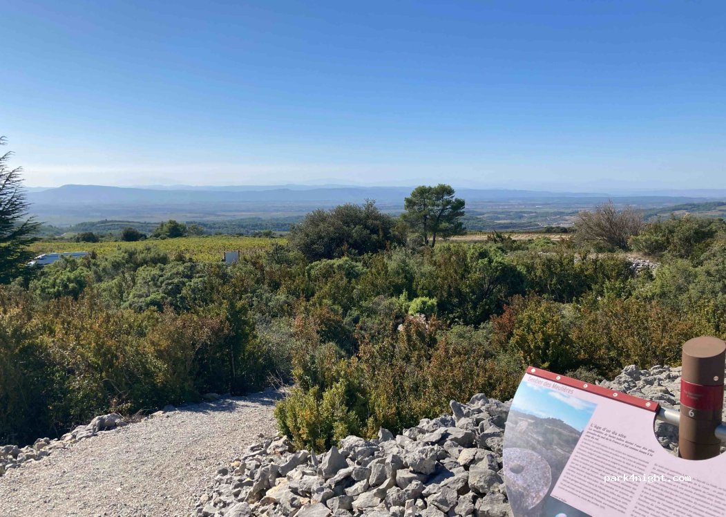 Small parking lot at the Sentier des Meulieres. Very quiet in the middle of nowhere, unfortunately at an angle. But it's better right next to it. Magnificent view over the vineyards of La Liviniere into the MIDI plain, with the Pyrenees peaks in the background, fantastic at sunrise. The Sentier deserves a walk.