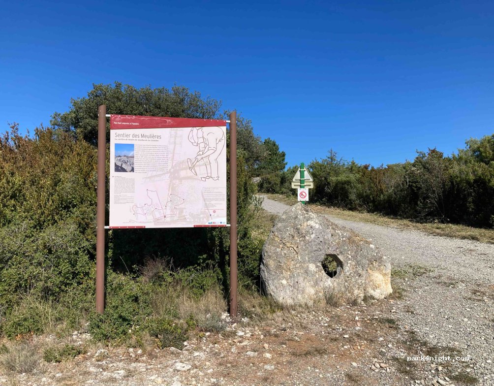 Petit parking au Sentier des Meulières. Très calme au milieu de nulle part, malheureusement en angle. Mais c'est mieux juste à côté. Magnifique vue sur les vignes de La Livinière jusqu'à la plaine du MIDI, avec les sommets des Pyrénées en fond, fantastique au lever du soleil. Le Sentier mérite une promenade.
