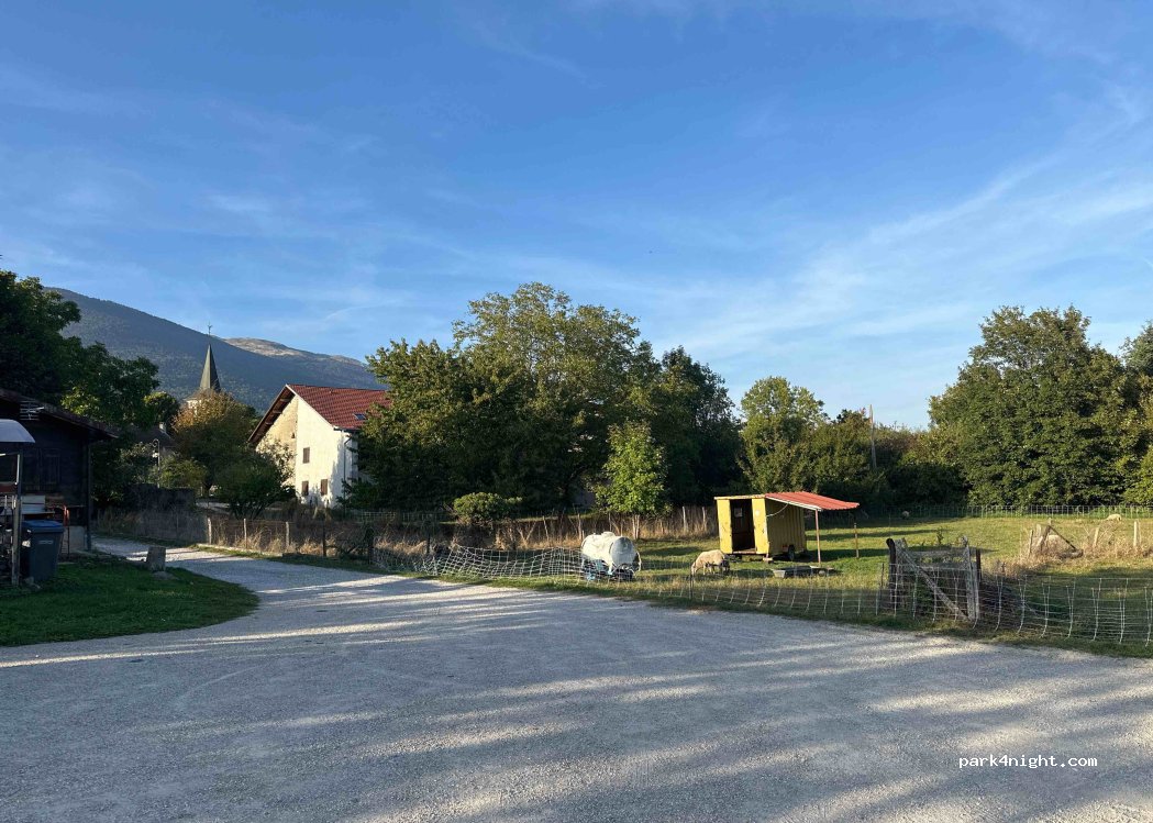 This is a lovely hidden place tucked away behind a village near Geneva, perfect for visiting CERN. Flat ground, plenty of space, a water tap is next to the Petanque court, otherwise no facilities, so your own toilet is essential. Many thanks to the village for providing this place!