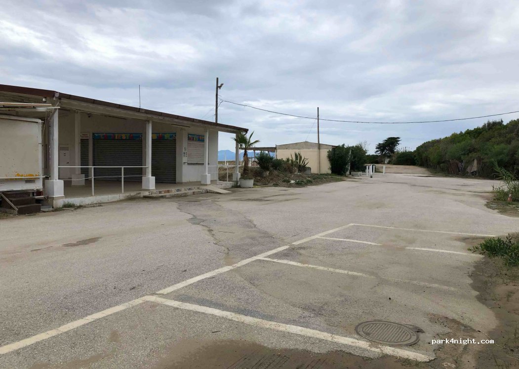 Piccolo parcheggio di un lido, asfaltato pulito e con bidoni della spazzatura. Praticamente sei in spiaggia e con una passeggiata di 3,5 km a piedi sei al parco archeologico di Paestum. Con una passeggiata in spiaggia ed una passeggiata al parco archeologico hai già fatto tutto. Va bene per una notte.