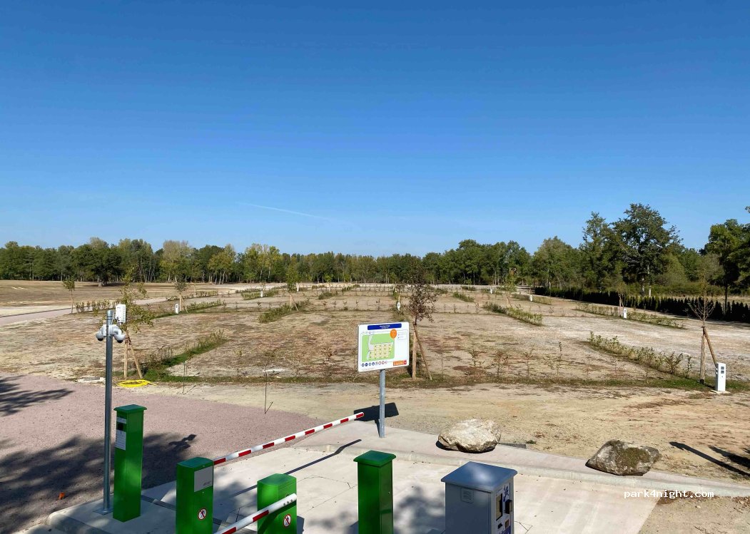 Aire magnifique avec 30 hectares de verdure et des lacs. Véhicule xxl sans problème. Accès très facile à l’aire où la vidange. Très calme