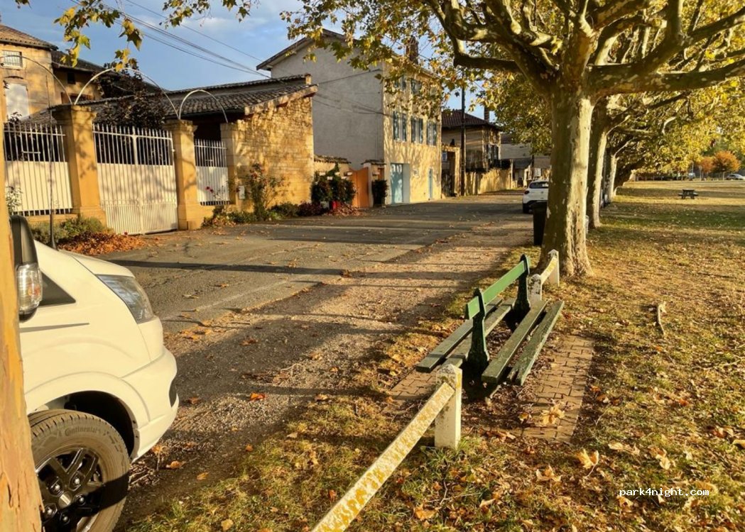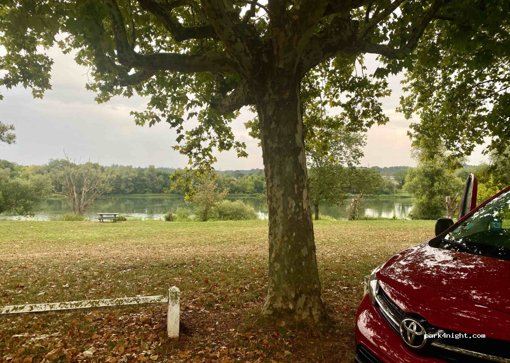 parking sous les arbres au bord de l'eau, calme propre plat, attention à la hauteur des branches. merci a la commune