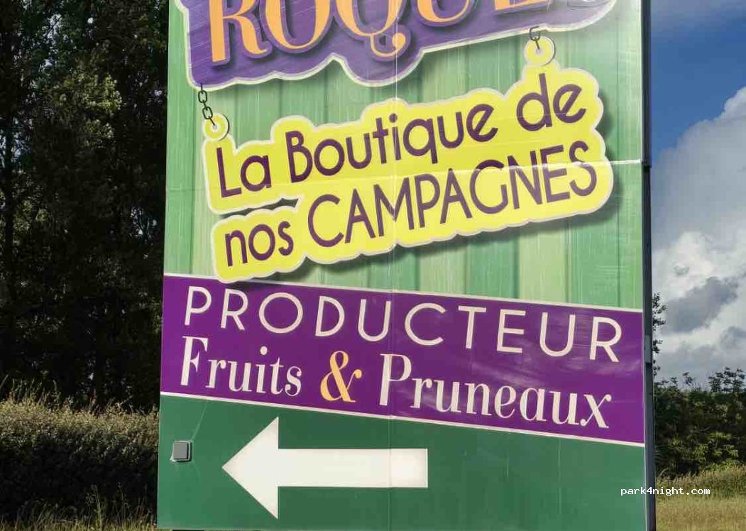 Ferme ROQUES Camping-Car-Bereich bei einem Hersteller von Agen-Pflaumen, Kiwi, Apfel, Hofladen und drei Wohnmobilstellplätzen mit Grill sehr willkommen Ich empfehle es. GPS-Koordinaten 0 ° 27'44 "Ost 44 ° 12'29" Nord