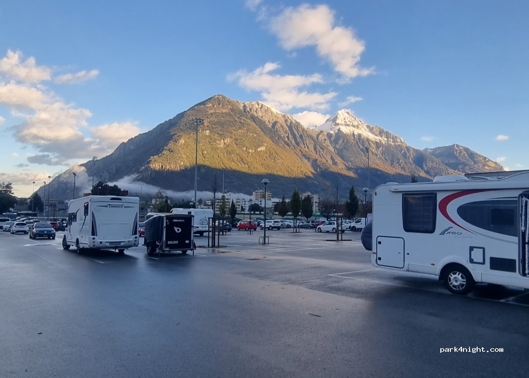 Groot parkeerterrein met veel plek. Het is er rustig. ‘s nachts hoor je niets, overdag hoor je auto’s (er loopt een snelweg). Prima voor een overnachting als je onderweg bent!
