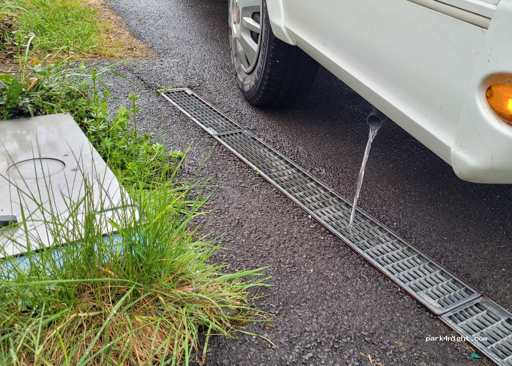Leider konnten wir hier kein Wasser ablassen, da die Rinne so nah an dem Abwasser dran ist, dass es ohne Schlauch nicht geht und man bergauf steht, sodass Wasser nicht ablaufen kann.