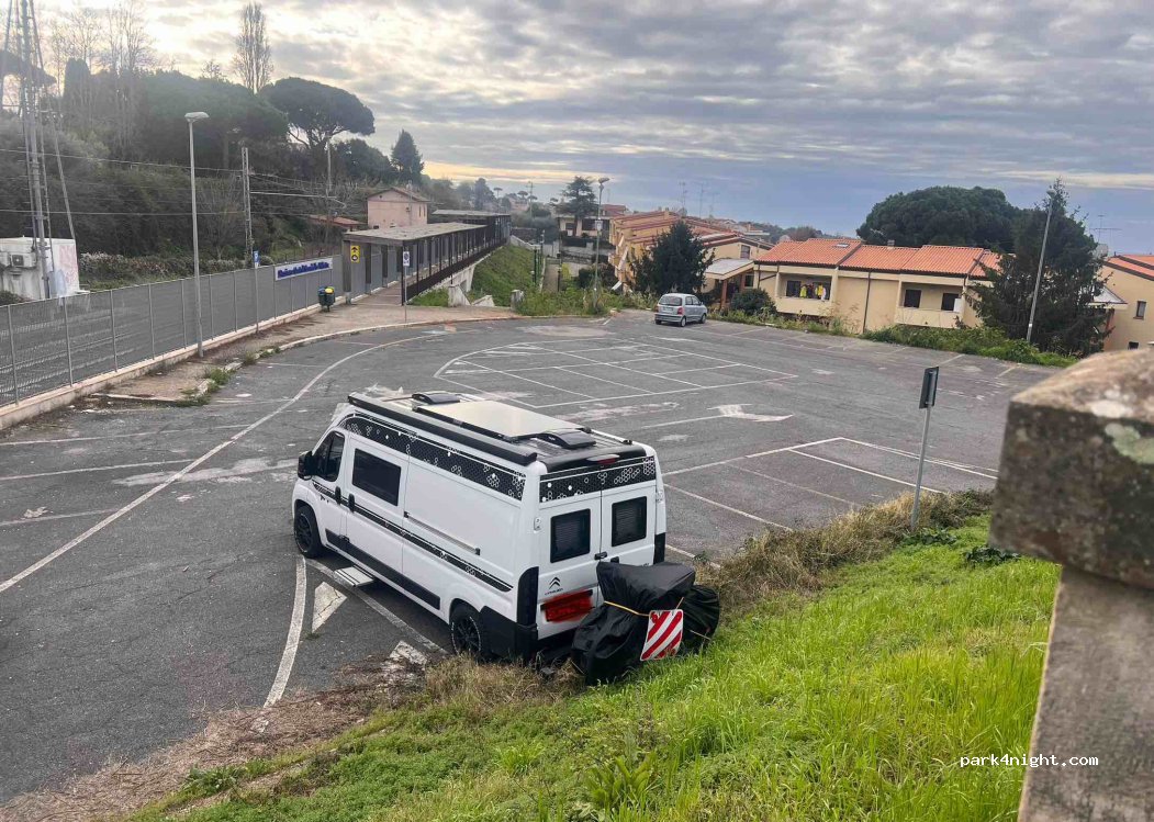 Petit parking de la gare de villetta parfait pour aller visiter Rome ! D'ici vous pouvez prendre le train qui vous emmènera à la gare de Rome en moins d'une heure pour 2€10. La présence d'une caméra de sécurité est rassurante. Nous y avons passé 2 nuits relativement calmes. Aucun service, légèrement en pente et bonne connexion 4G.