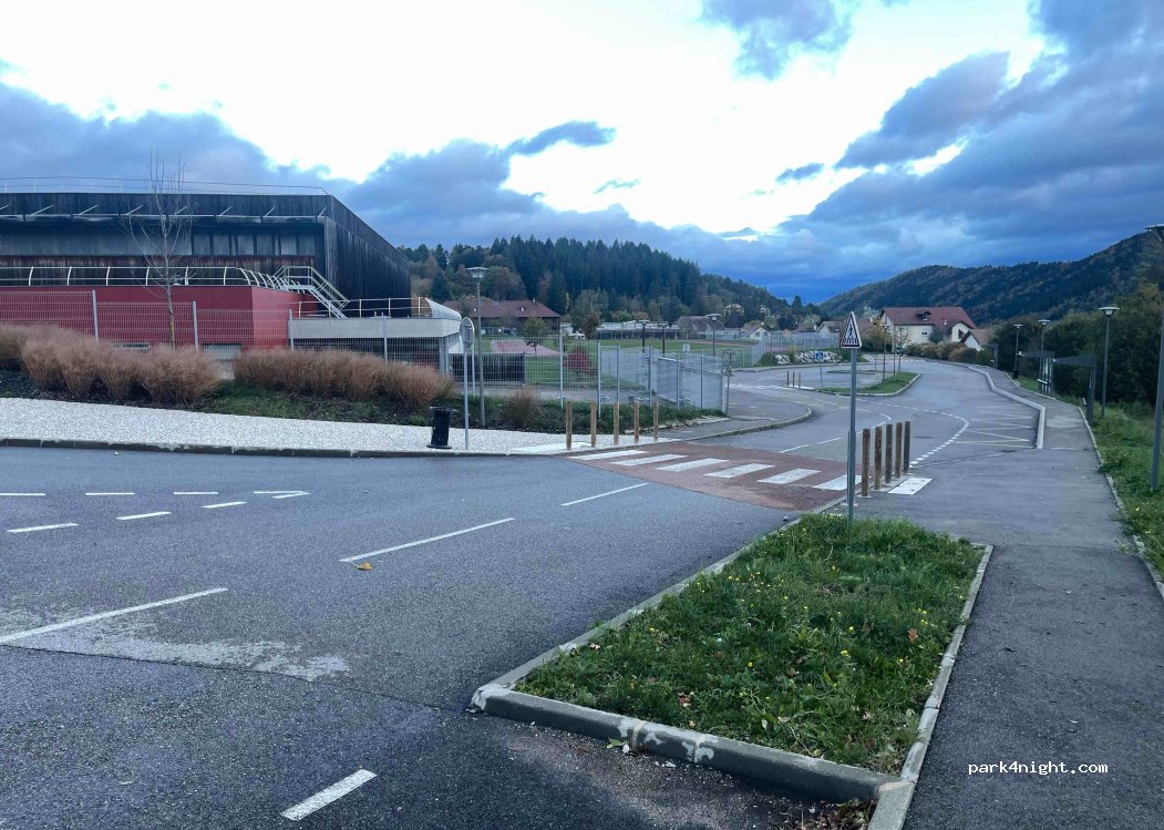 Parkplatz der Turnhalle Marcel CUYNAT, Reihenparkplätze für kleine Fahrzeuge und Stellplätze für große Fahrzeuge. Kein Service.