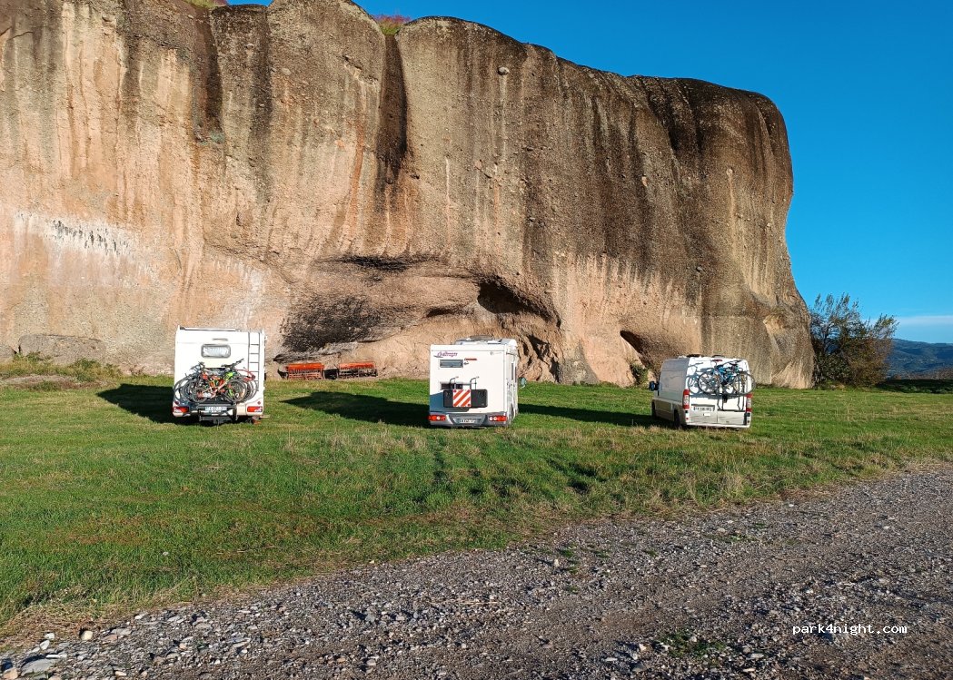 Super endroit où séjourner, beaucoup d’ombre, habitants très sympathiques. Dans le village voisin, il y a une magnifique taverne. Derrière le météore, il y a un pont historique du 16ème siècle et le lit de l’un des plus grands fleuves de Grèce. Le seul inconvénient est les moustiques après 20h00. À proximité, il y a un robinet d’eau et une poubelle.