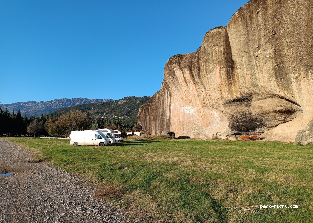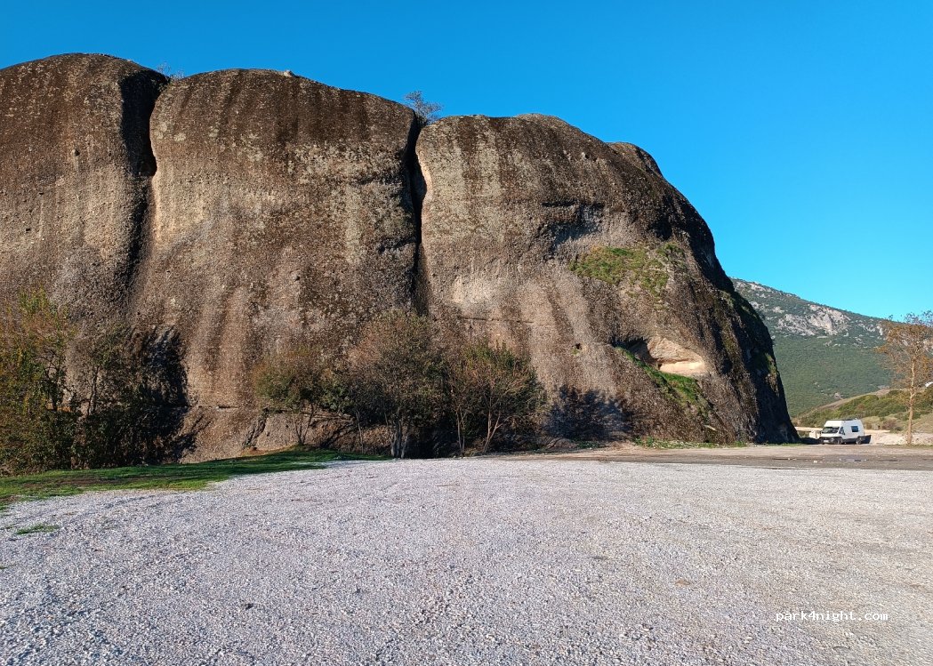 Guter Platz. Ebene Plätze gibt es genug auf der Gras Seite oder auf der Schotterseite. Sehr laut tagsüber und nachts durch die stark befahrene Straße. Dennoch eine gute Möglichkeit außerhalb Meteoras zu parken und morgens reinzufahren. Für Kletterer gibt es genug Routen direkt am Felsen